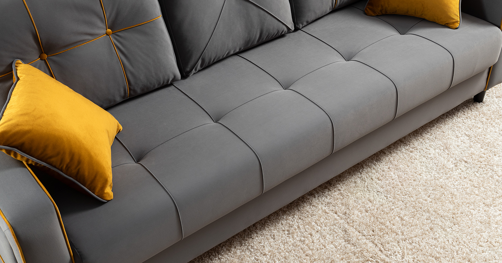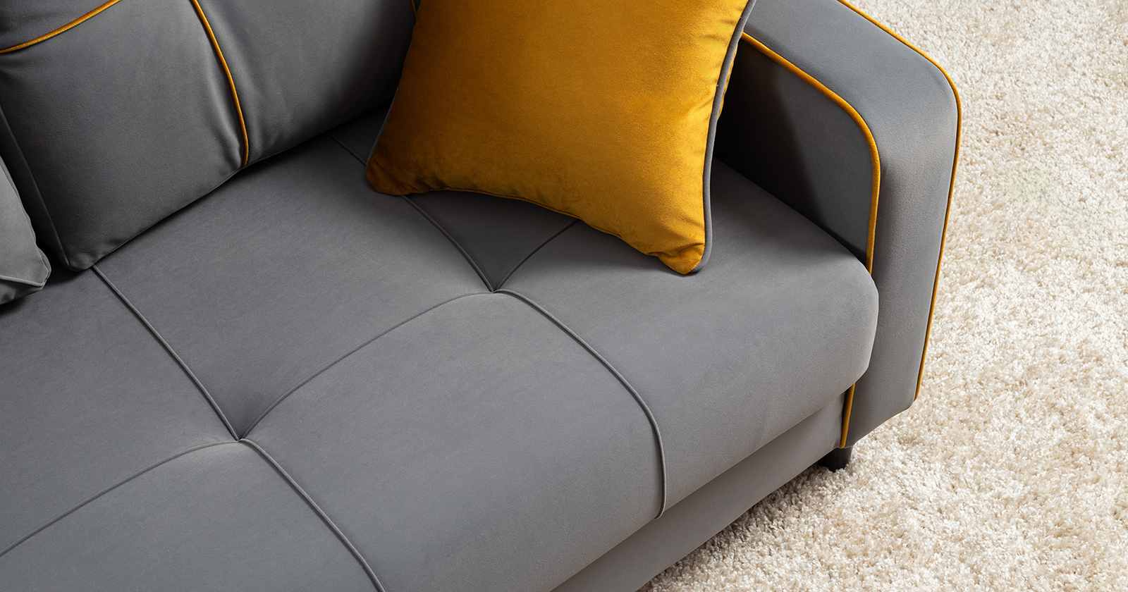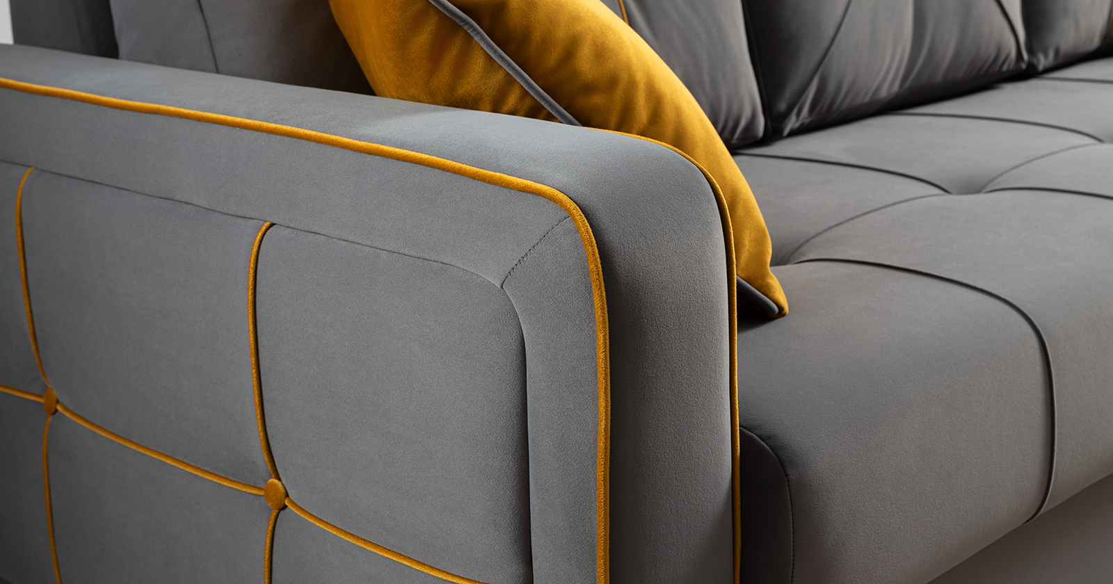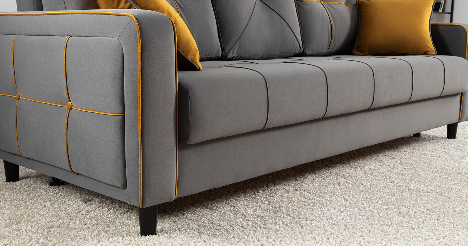 Декоративные канты на подушках и вставке подлокотников. Пуговицы в местах пересечения кантов на подушке и вставке подлокотников. По торцам подлокотников и думках контрастный декоративный кант. Защипы на сиденье и средней большой подушке.