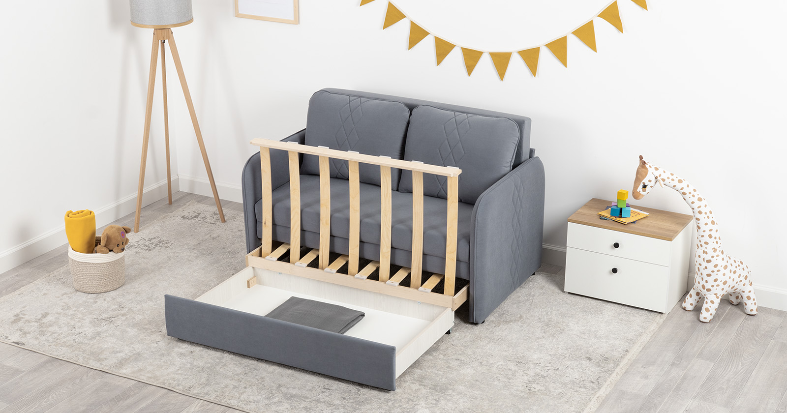 Стильный компактный диван для детской и гостиной. При своих скромных размерах он трансформируется в полноценное спальное место для детей и подростков. Лаконичный дизайн в виде декоративной стежки подчеркивает фактуру велюра, а небольшие размеры позволят разместить его в любом пространстве.