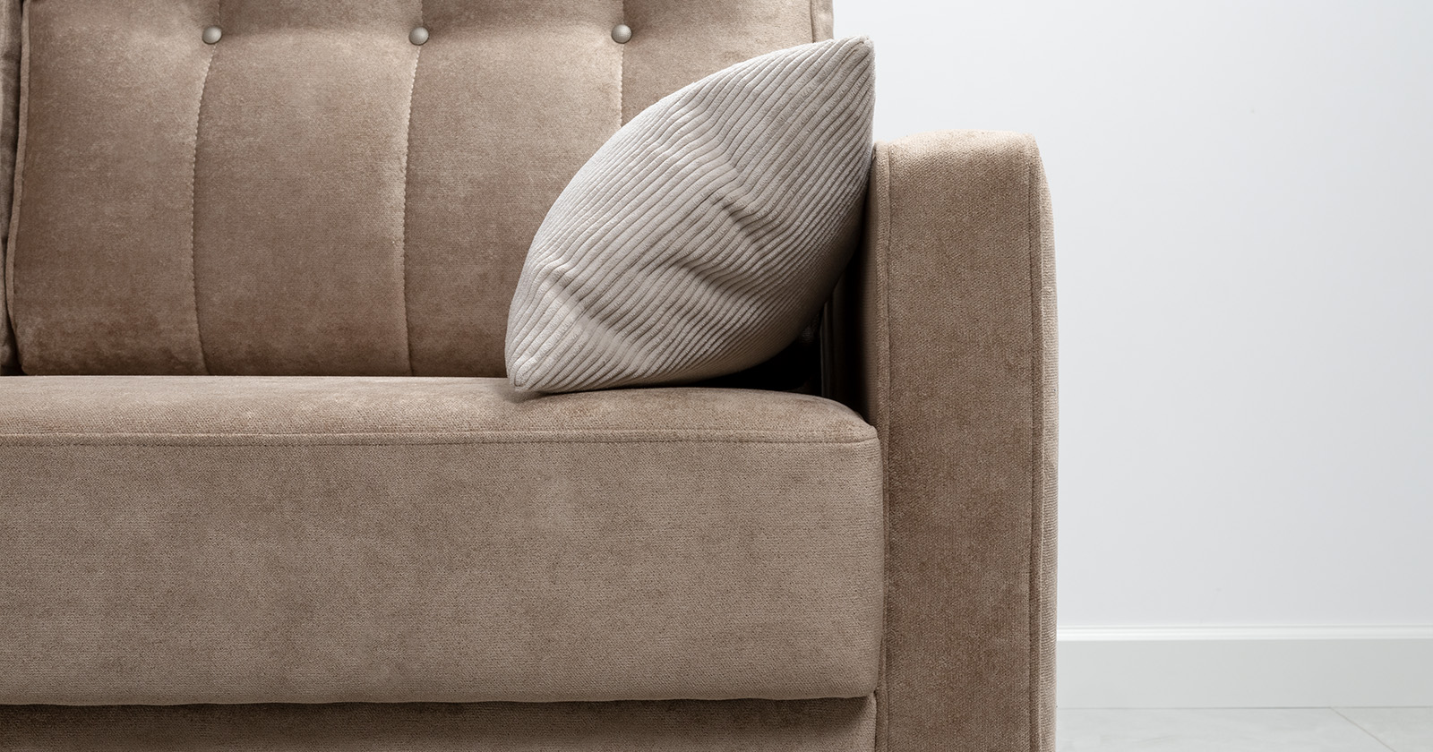 Модель с универсальным углом подойдёт любителям часто менять обстановку. Устойчивые конесообразные деревянные ножки придают дивану легкость и изящество. Для завершения интерьера можно заказать кресло Арно.