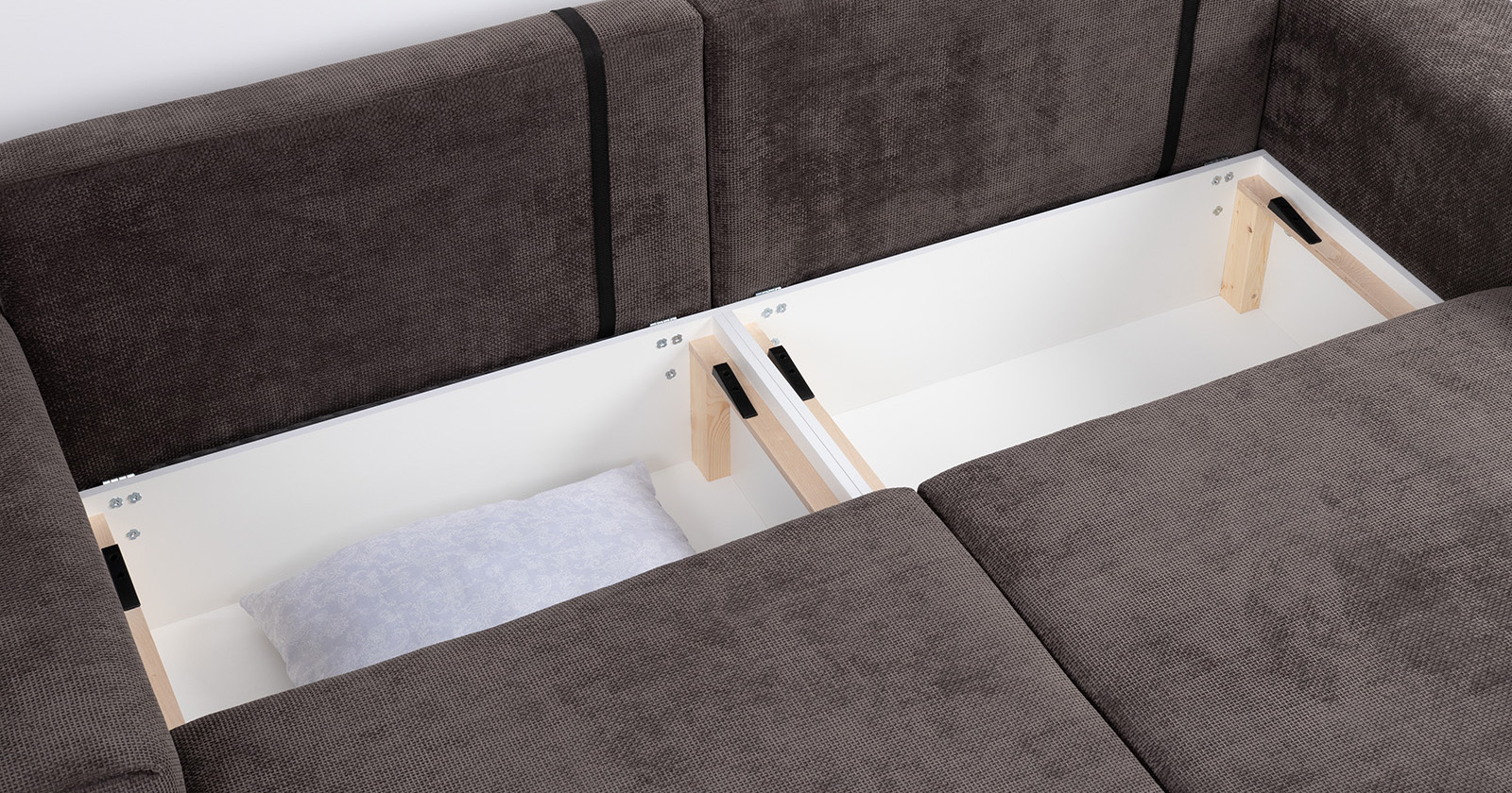 «Компоновка 5» состоит из: оттоманки арт. ТО, дивана арт. ТД, узкого подлокотника арт. ТБ, широкого подлокотника с ящиком арт. ТБ, двух приспинных подушек и двух декоративных подушек.