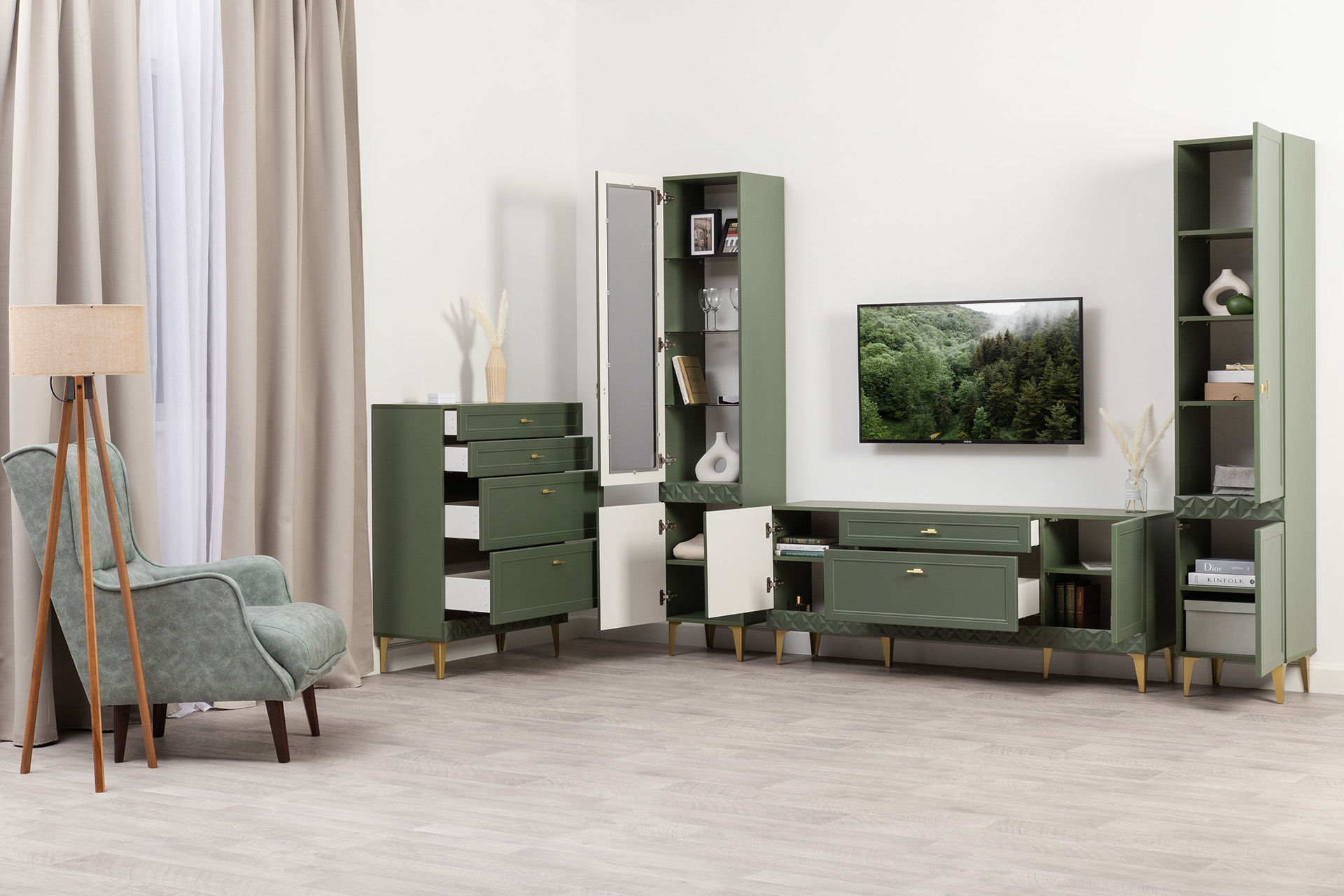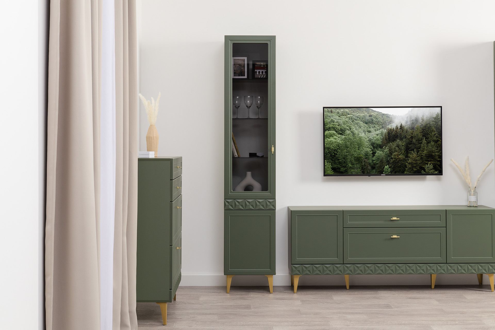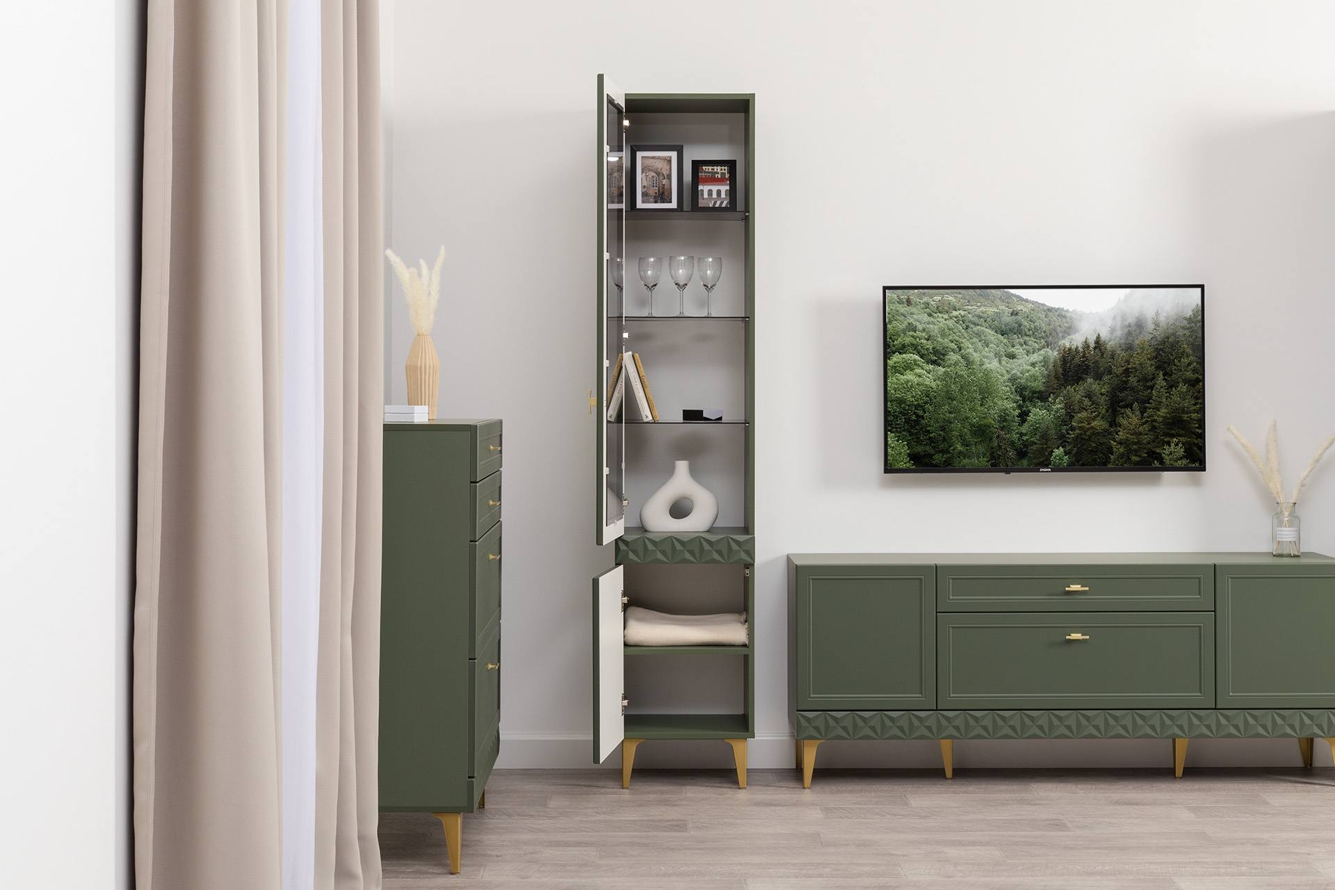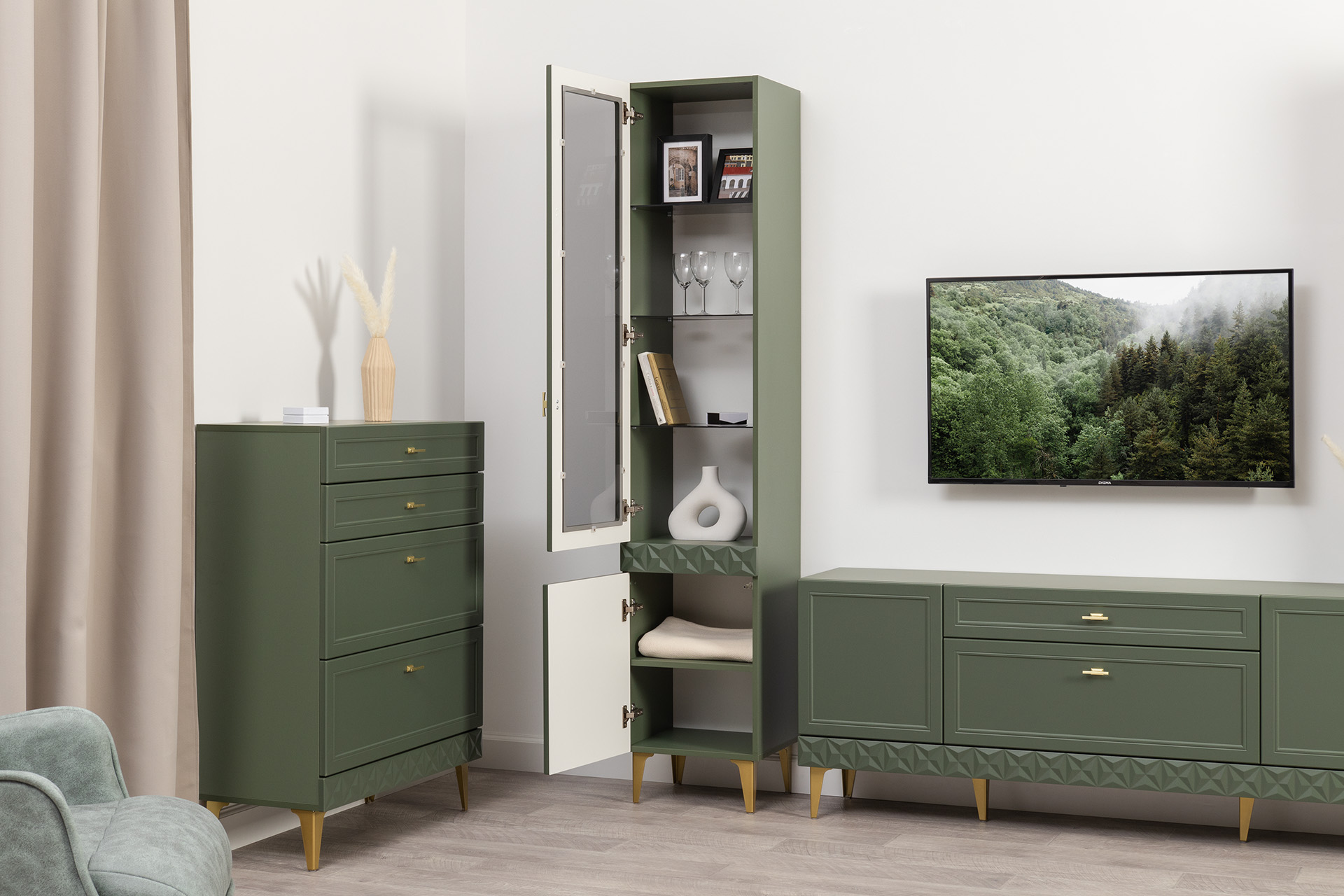 Изящные линии, глубокая фрезеровка фасадов из МДФ и благородные оттенки. Утончённая «Слоновая кость» и изысканная «Олива Шагрень» с глубоким зелёным тоном — создают атмосферу уюта, тепла и благородства. Металлические ручки и опоры золотого цвета придают мебели утончённый блеск, а петли и направляющие с доводчиками обеспечивают плавное и бесшумное закрытие фасадов.