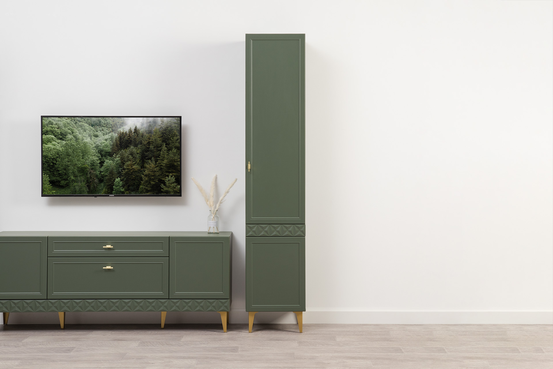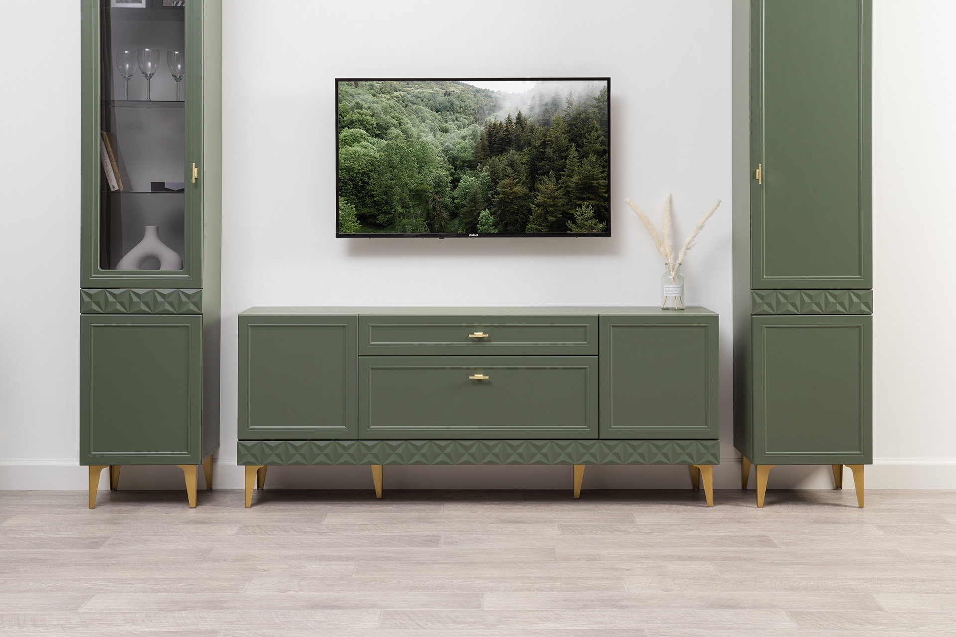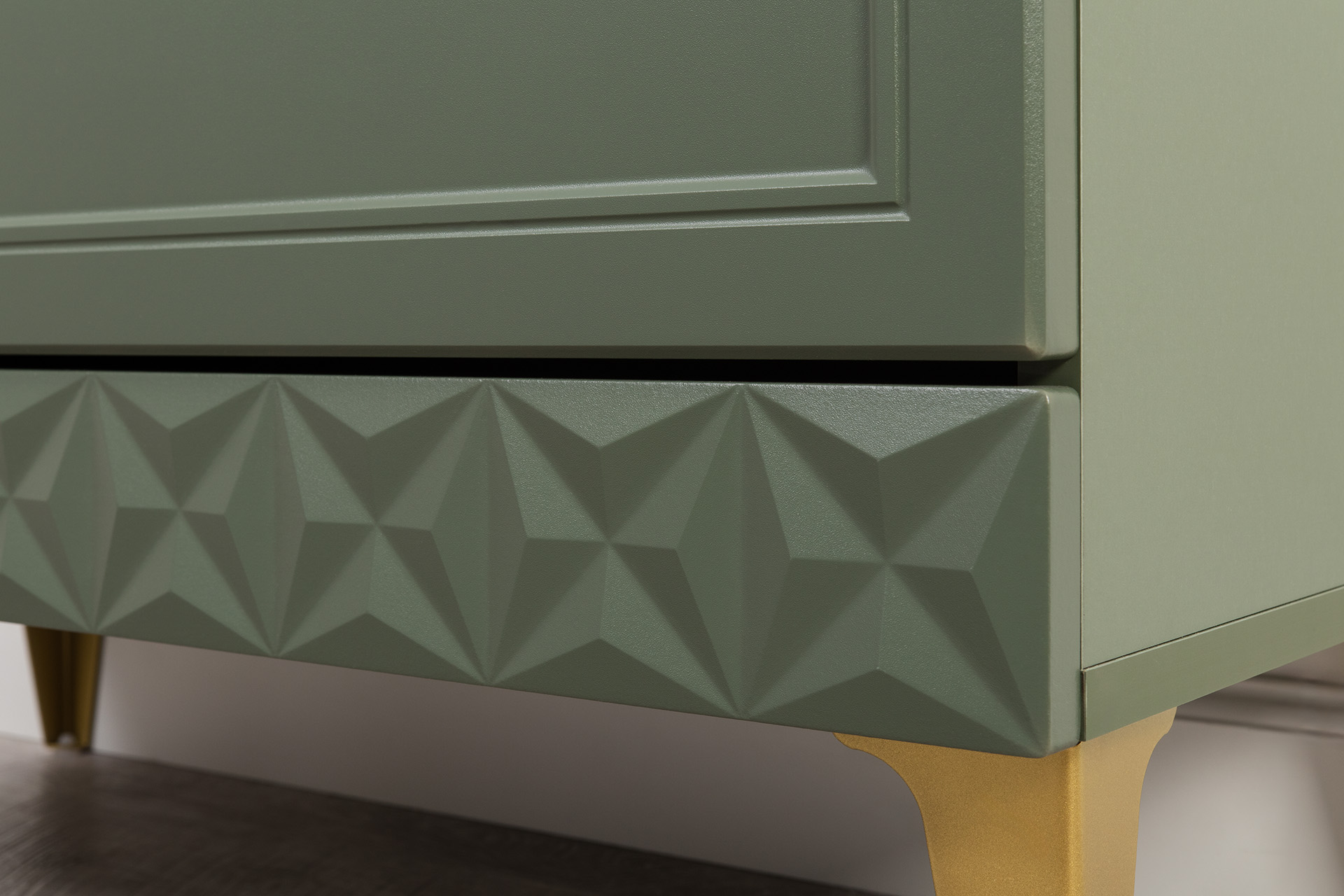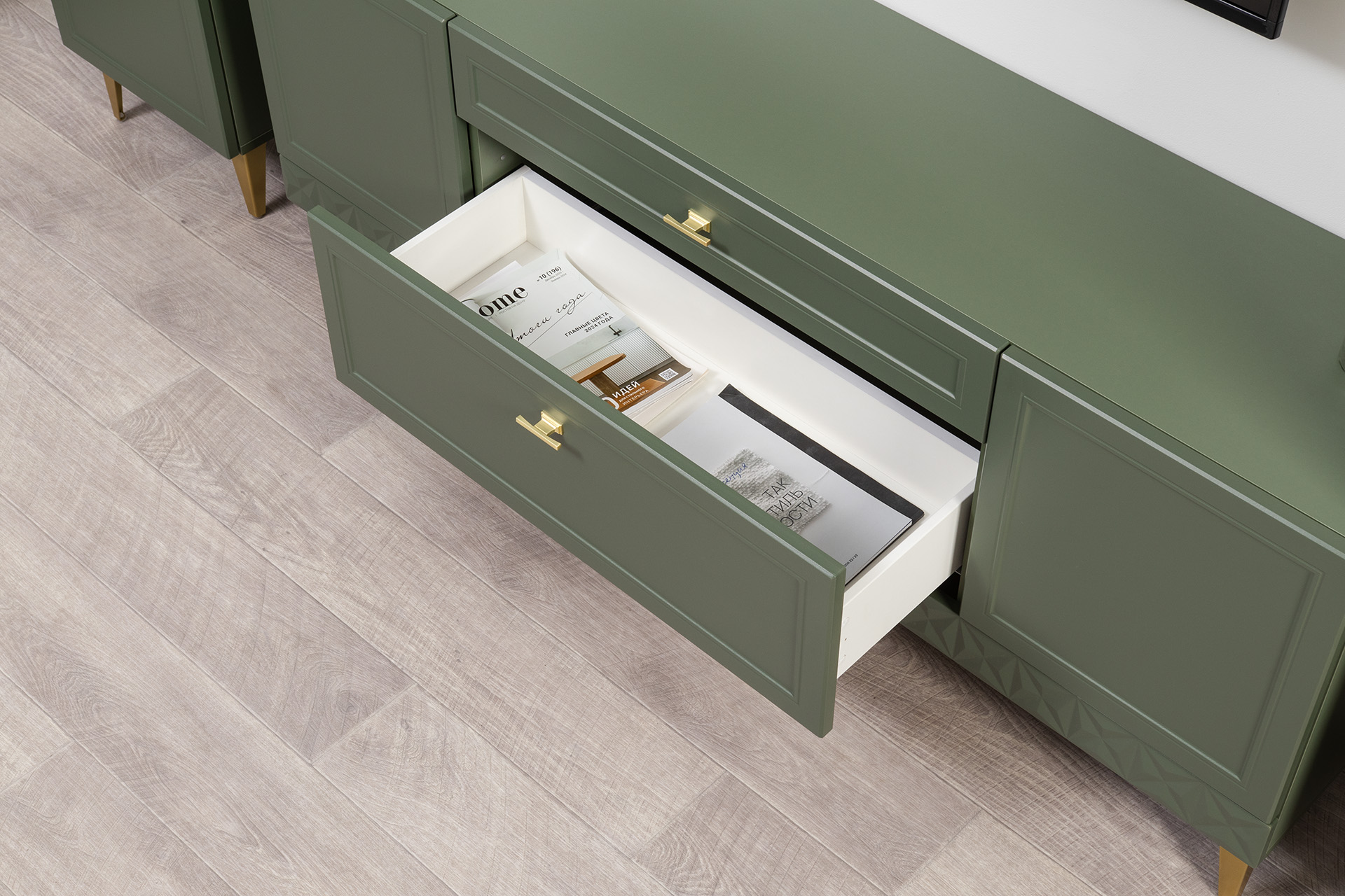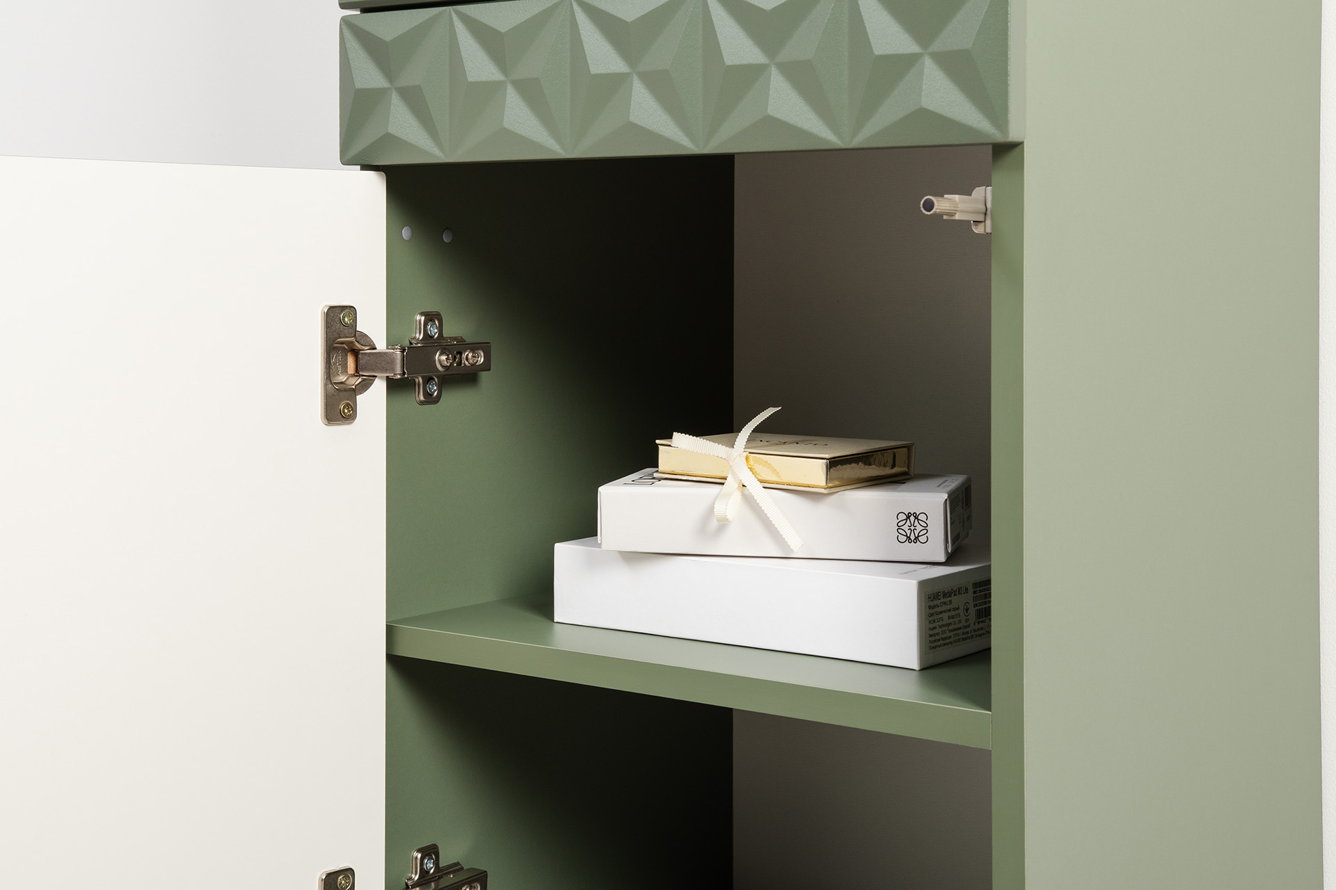 Изящные линии, глубокая фрезеровка фасадов из МДФ и благородные оттенки. Утончённая «Слоновая кость» и изысканная «Олива Шагрень» с глубоким зелёным тоном — создают атмосферу уюта, тепла и благородства. Металлические ручки и опоры золотого цвета придают мебели утончённый блеск, а петли и направляющие с доводчиками обеспечивают плавное и бесшумное закрытие фасадов.