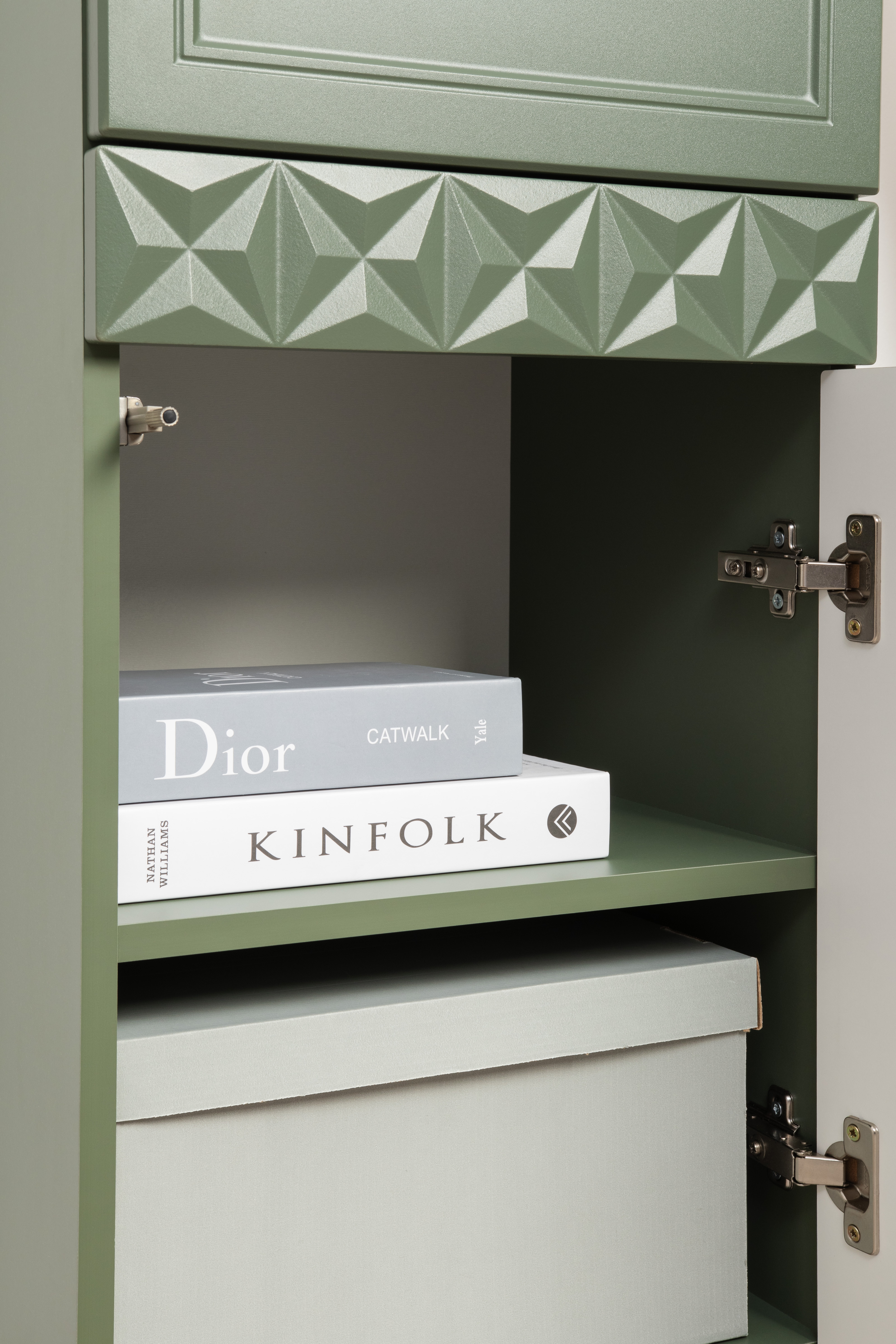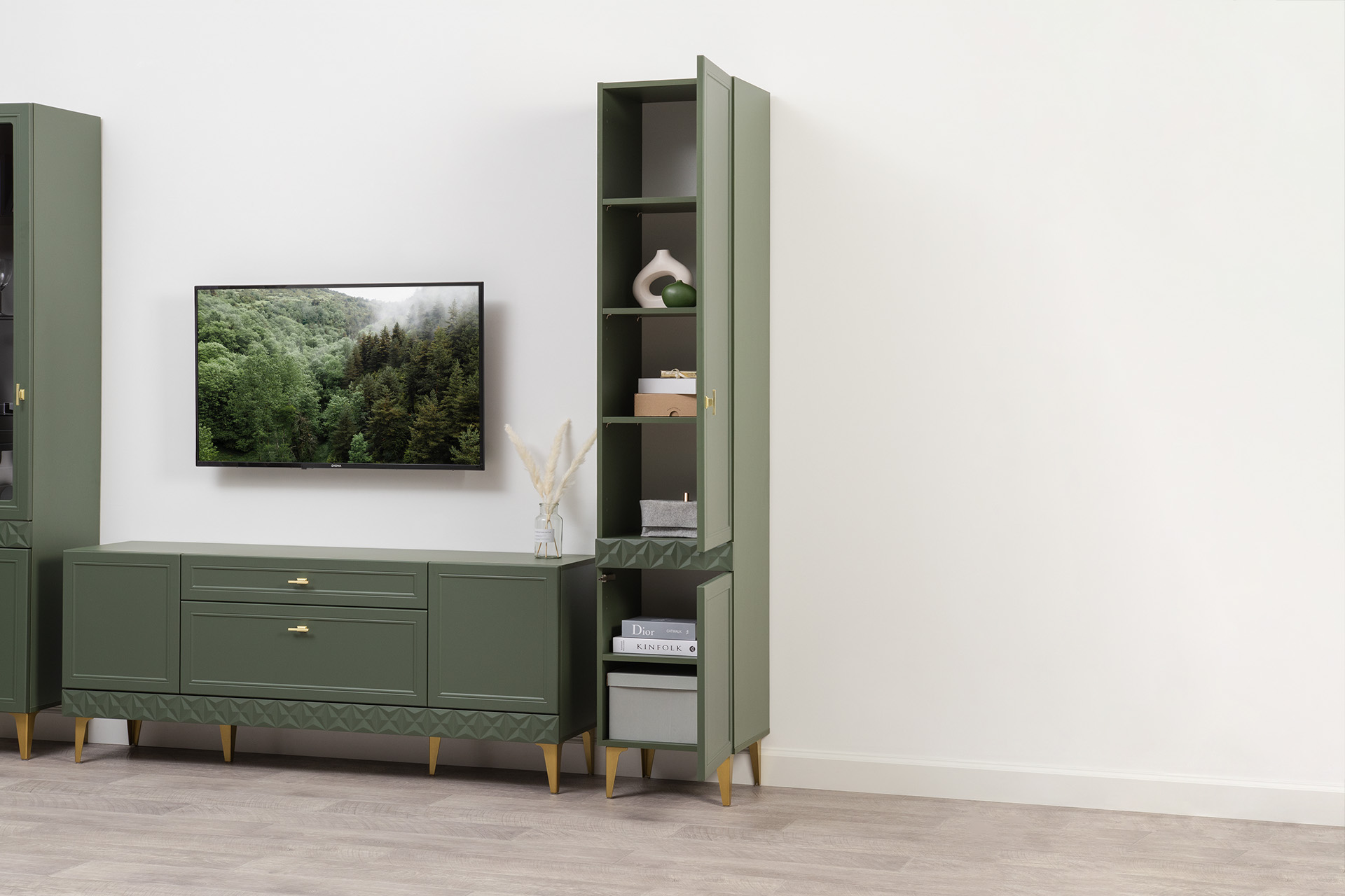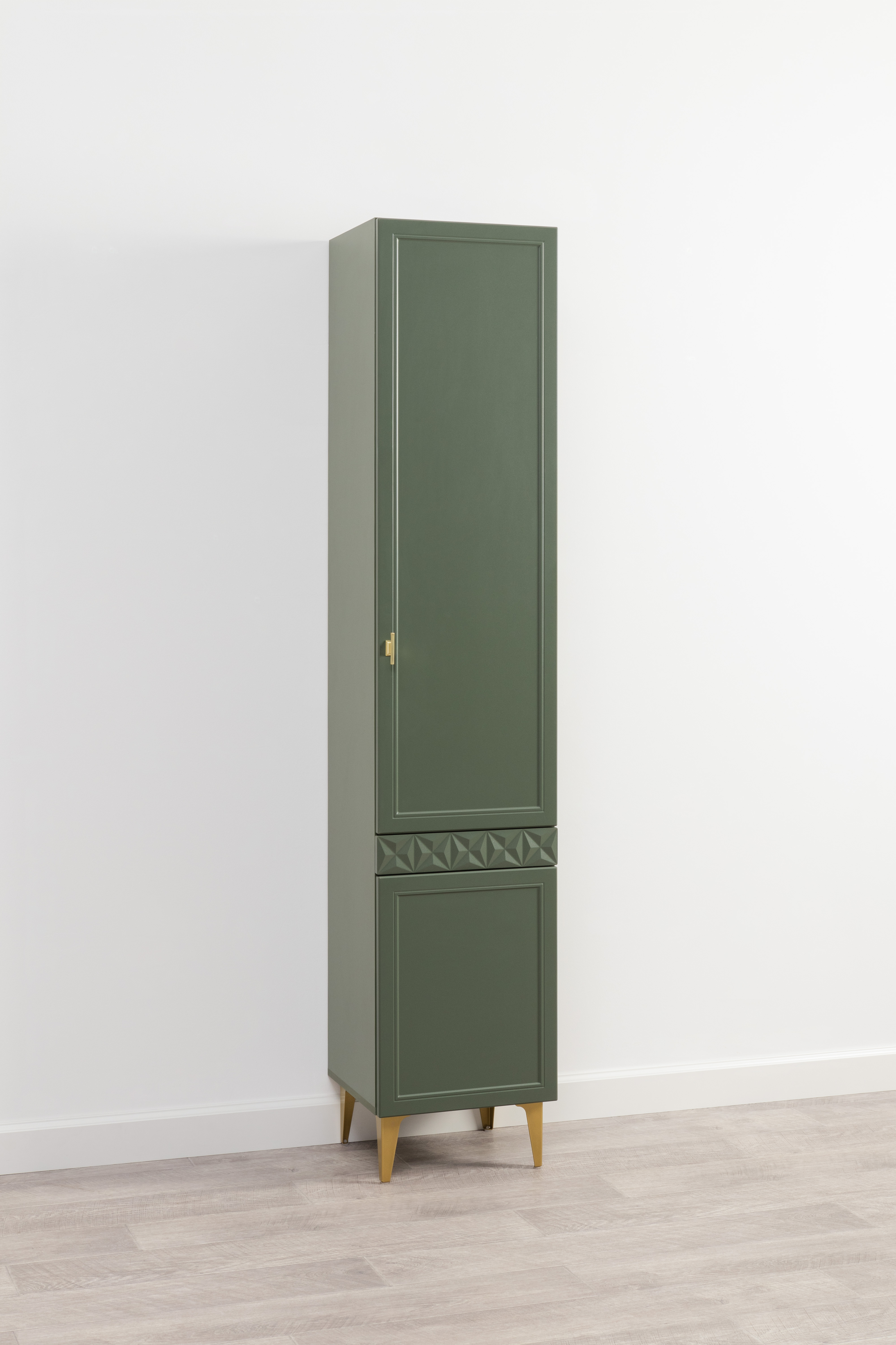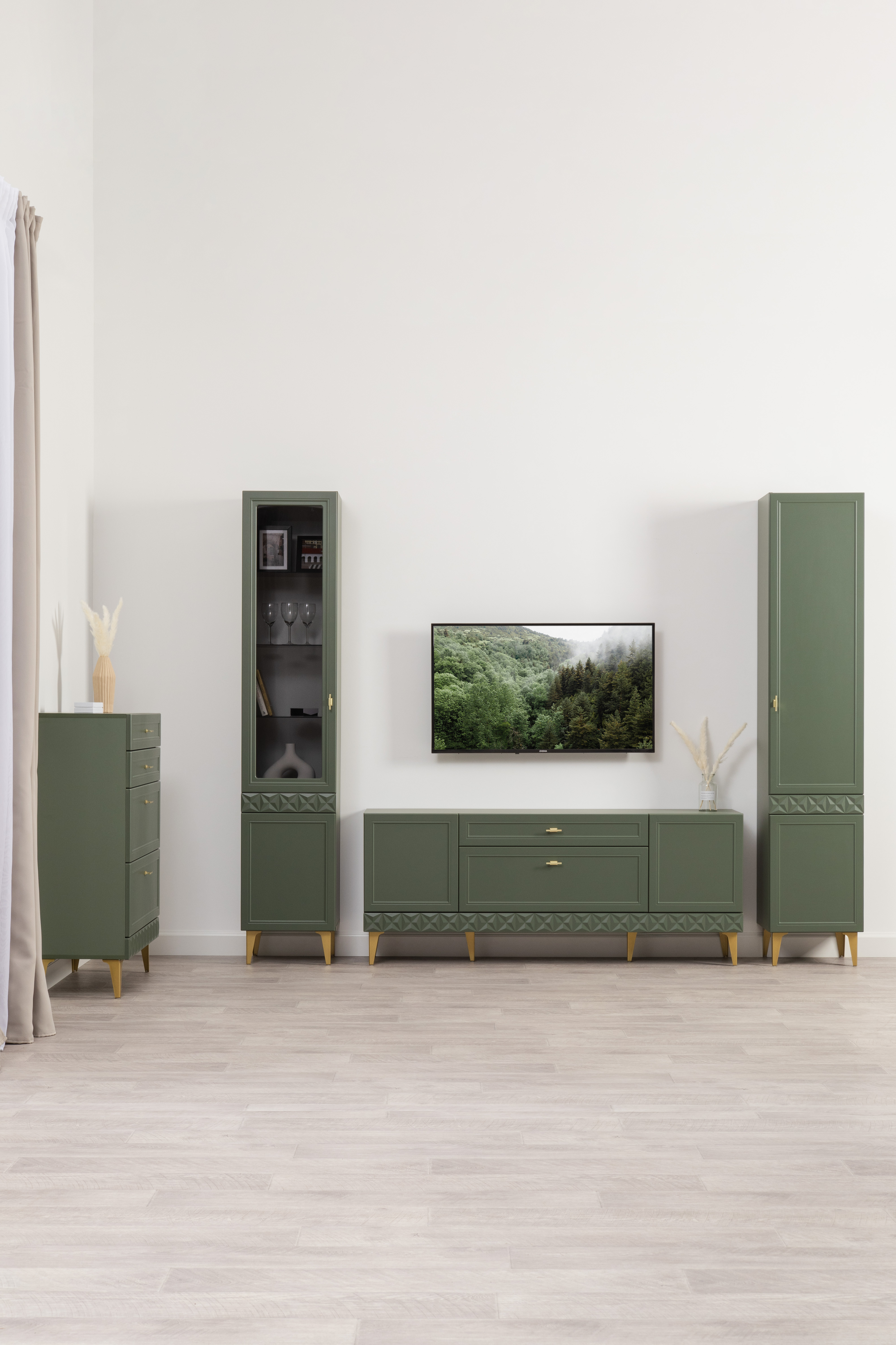 Изящные линии, глубокая фрезеровка фасадов из МДФ и благородные оттенки. Утончённая «Слоновая кость» и изысканная «Олива Шагрень» с глубоким зелёным тоном — создают атмосферу уюта, тепла и благородства. Металлические ручки и опоры золотого цвета придают мебели утончённый блеск, а петли и направляющие с доводчиками обеспечивают плавное и бесшумное закрытие фасадов.