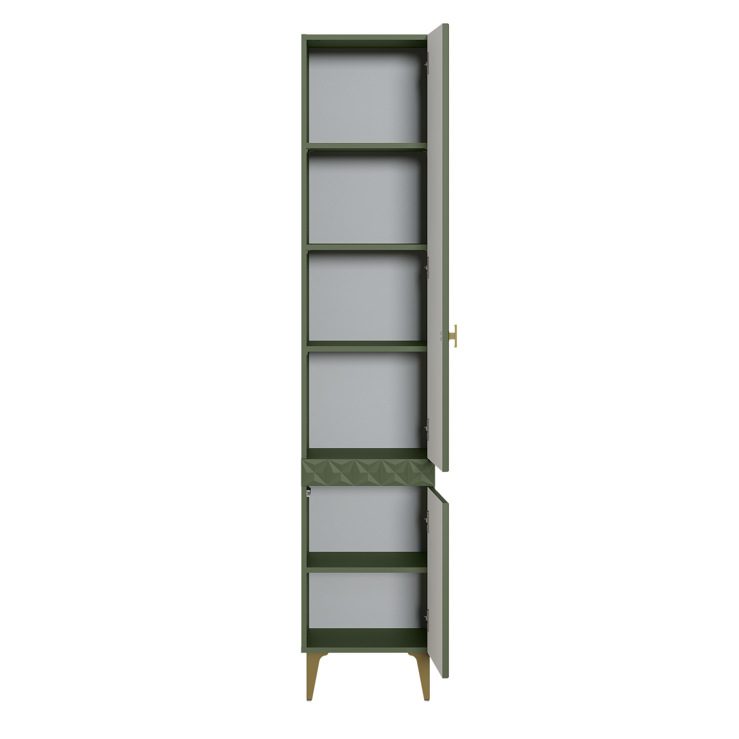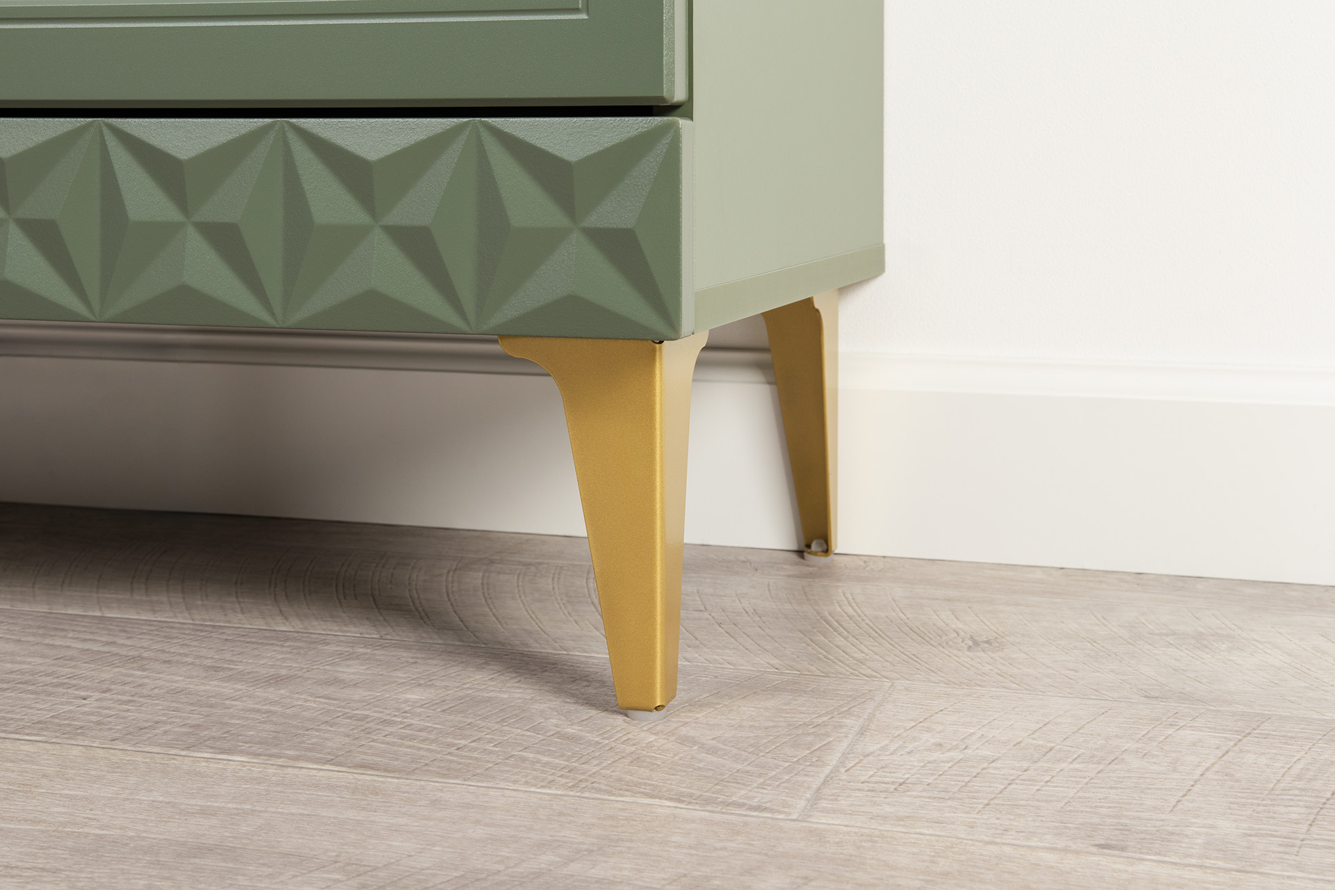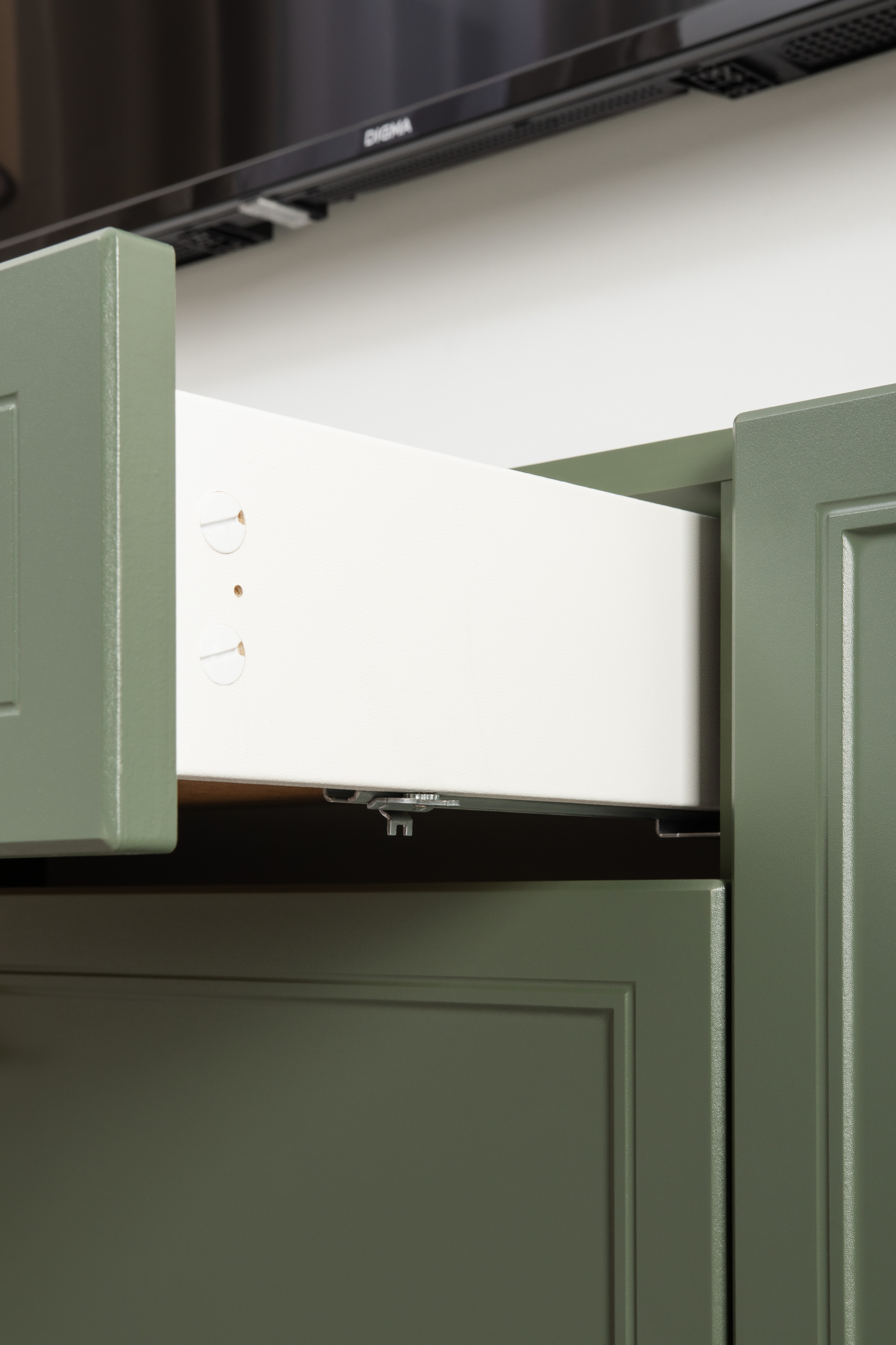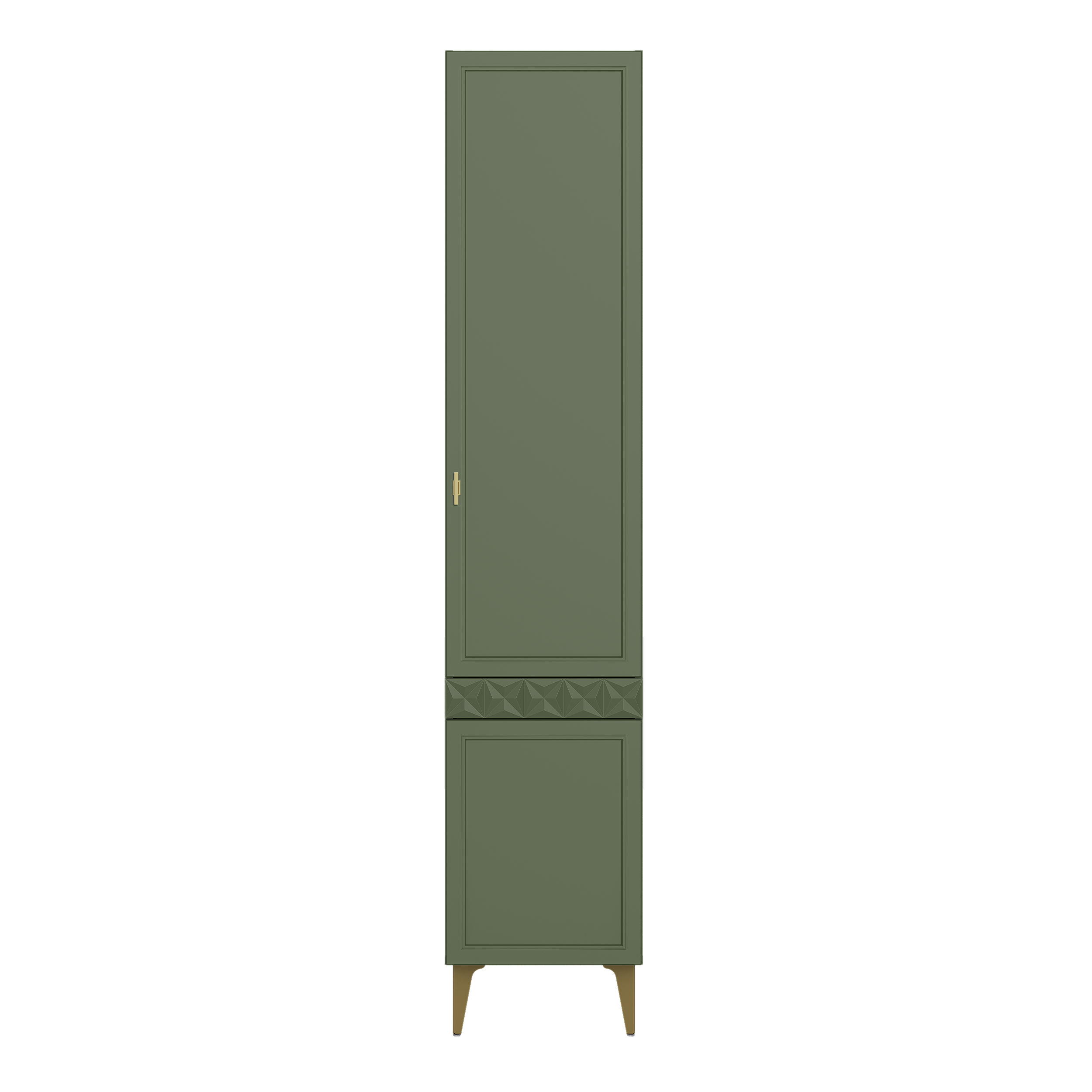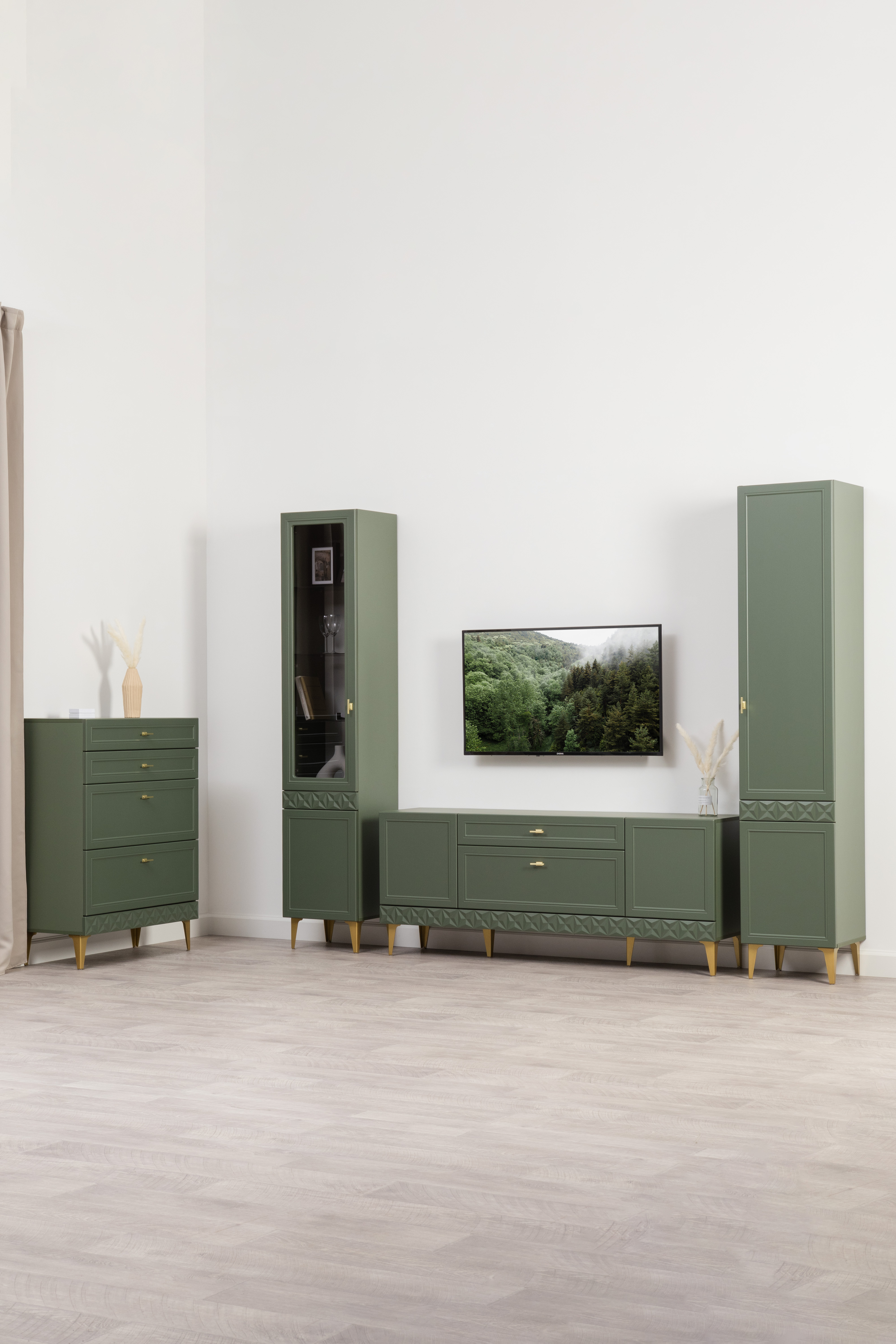 Изящные линии, глубокая фрезеровка фасадов из МДФ и благородные оттенки. Утончённая «Слоновая кость» и изысканная «Олива Шагрень» с глубоким зелёным тоном — создают атмосферу уюта, тепла и благородства. Металлические ручки и опоры золотого цвета придают мебели утончённый блеск, а петли и направляющие с доводчиками обеспечивают плавное и бесшумное закрытие фасадов.