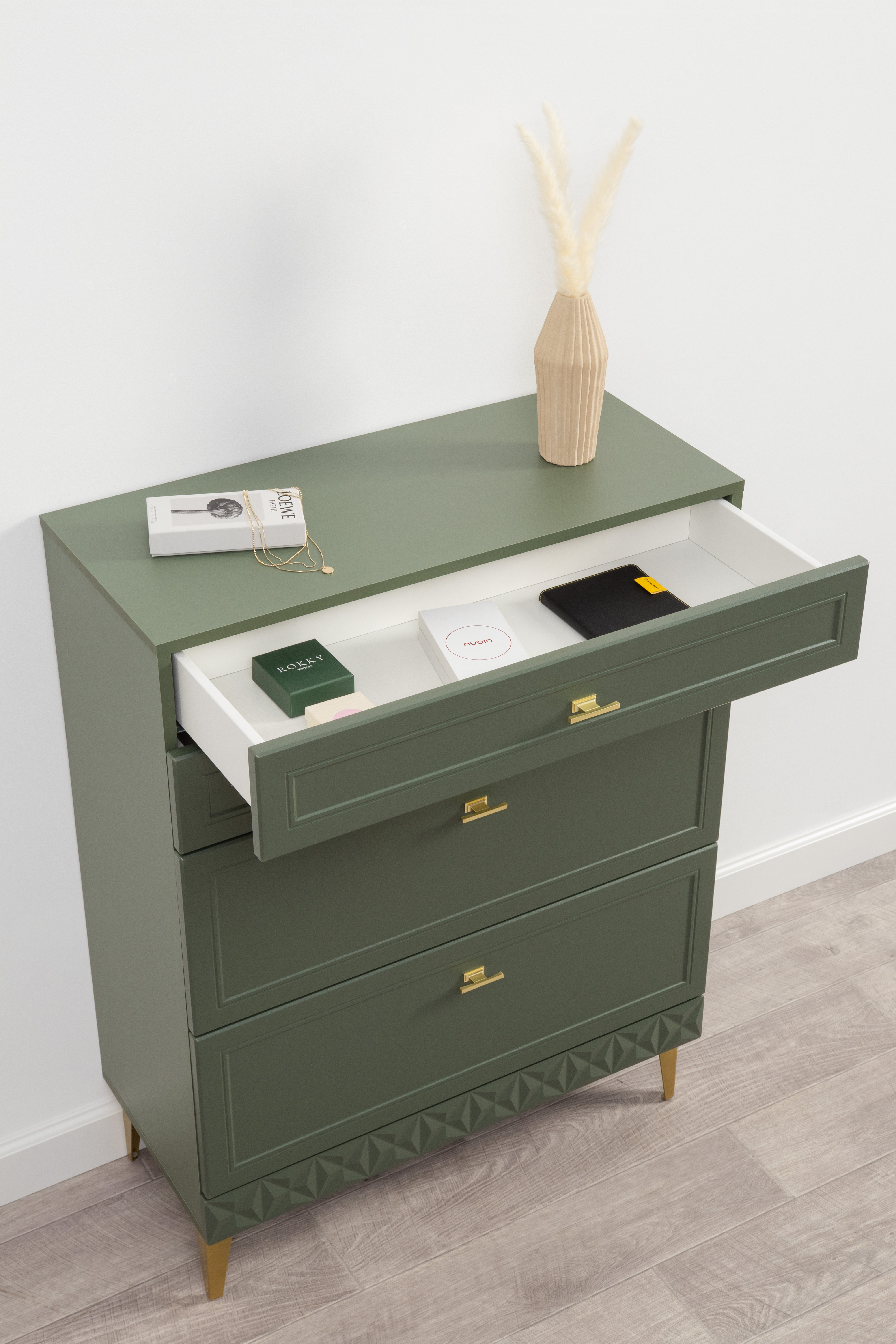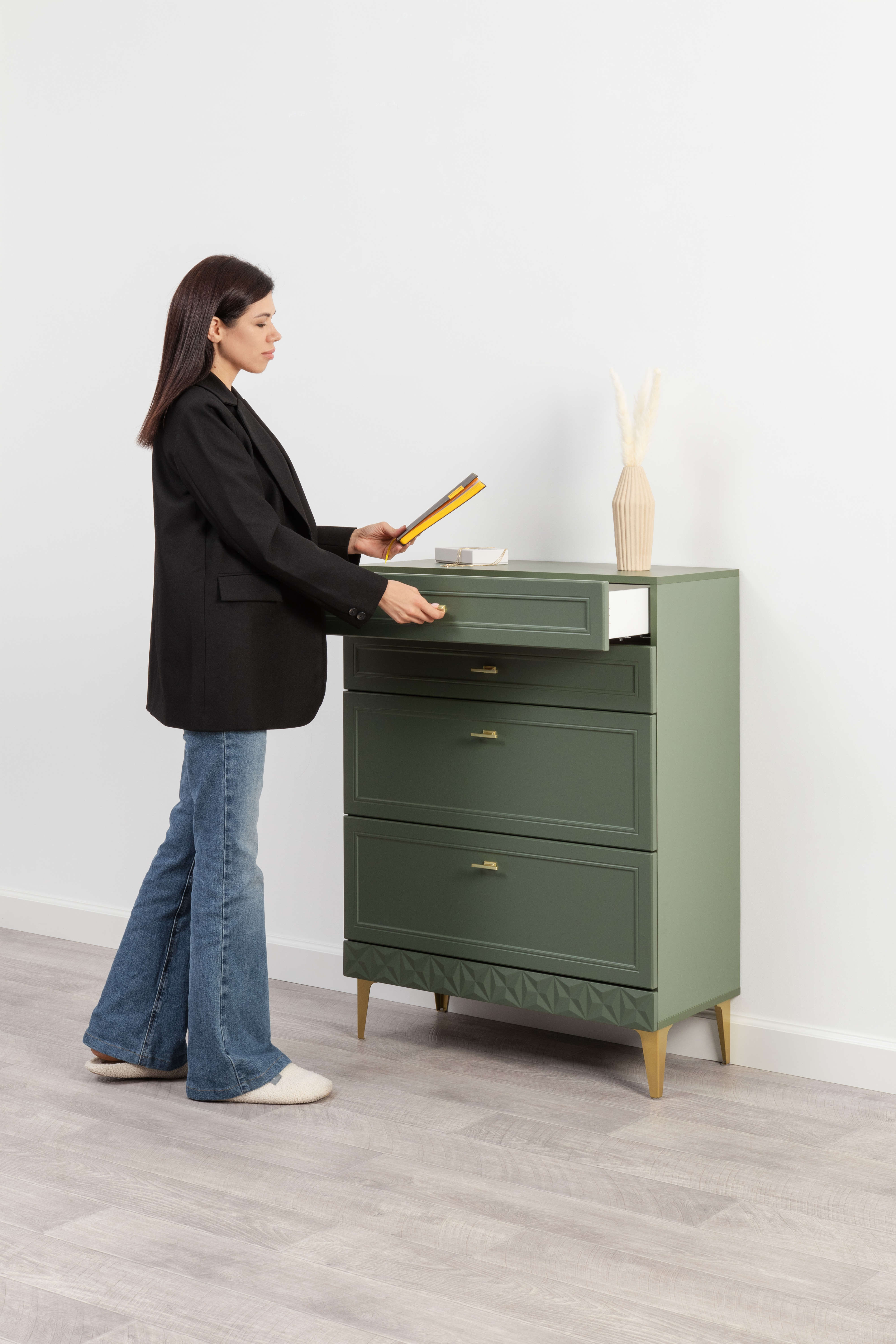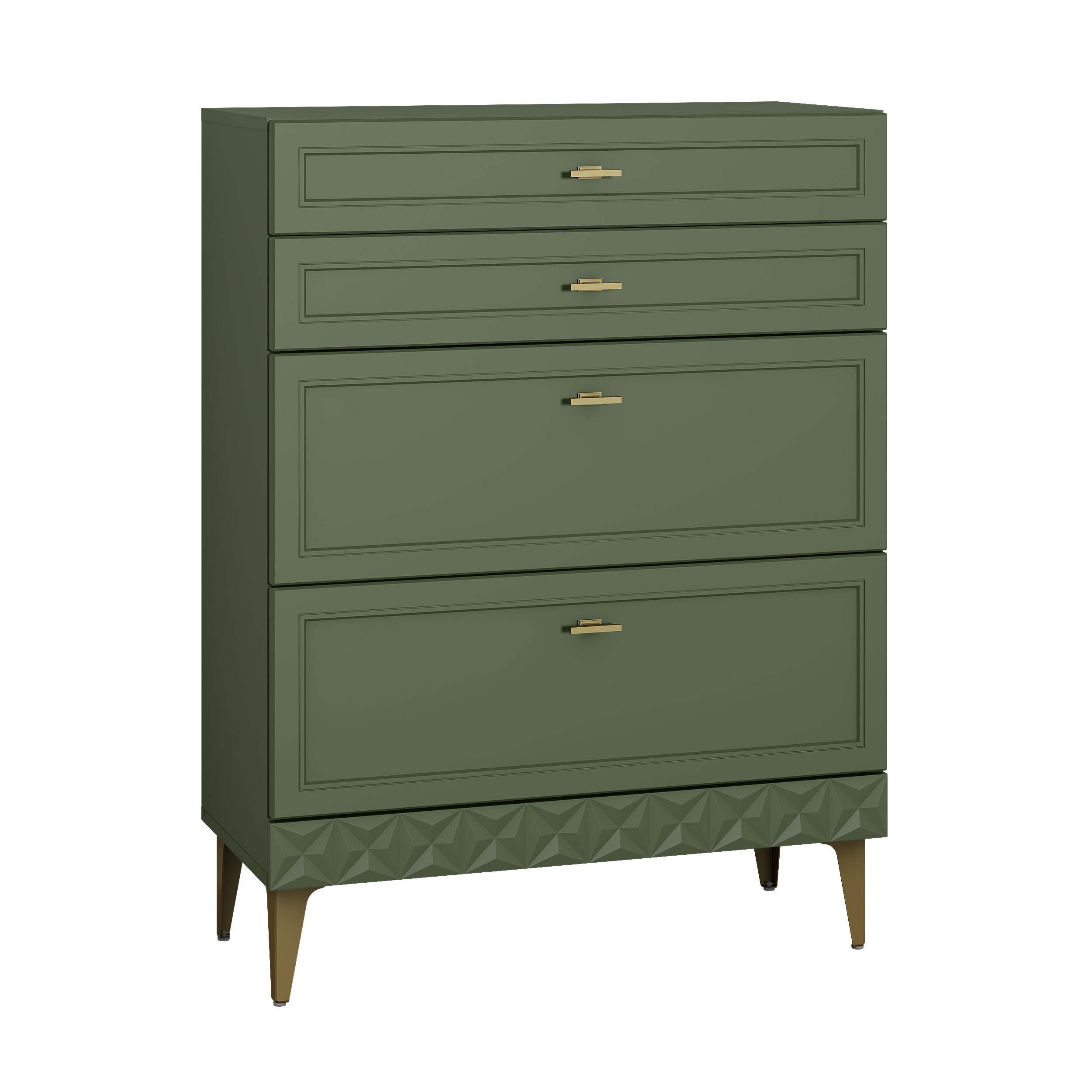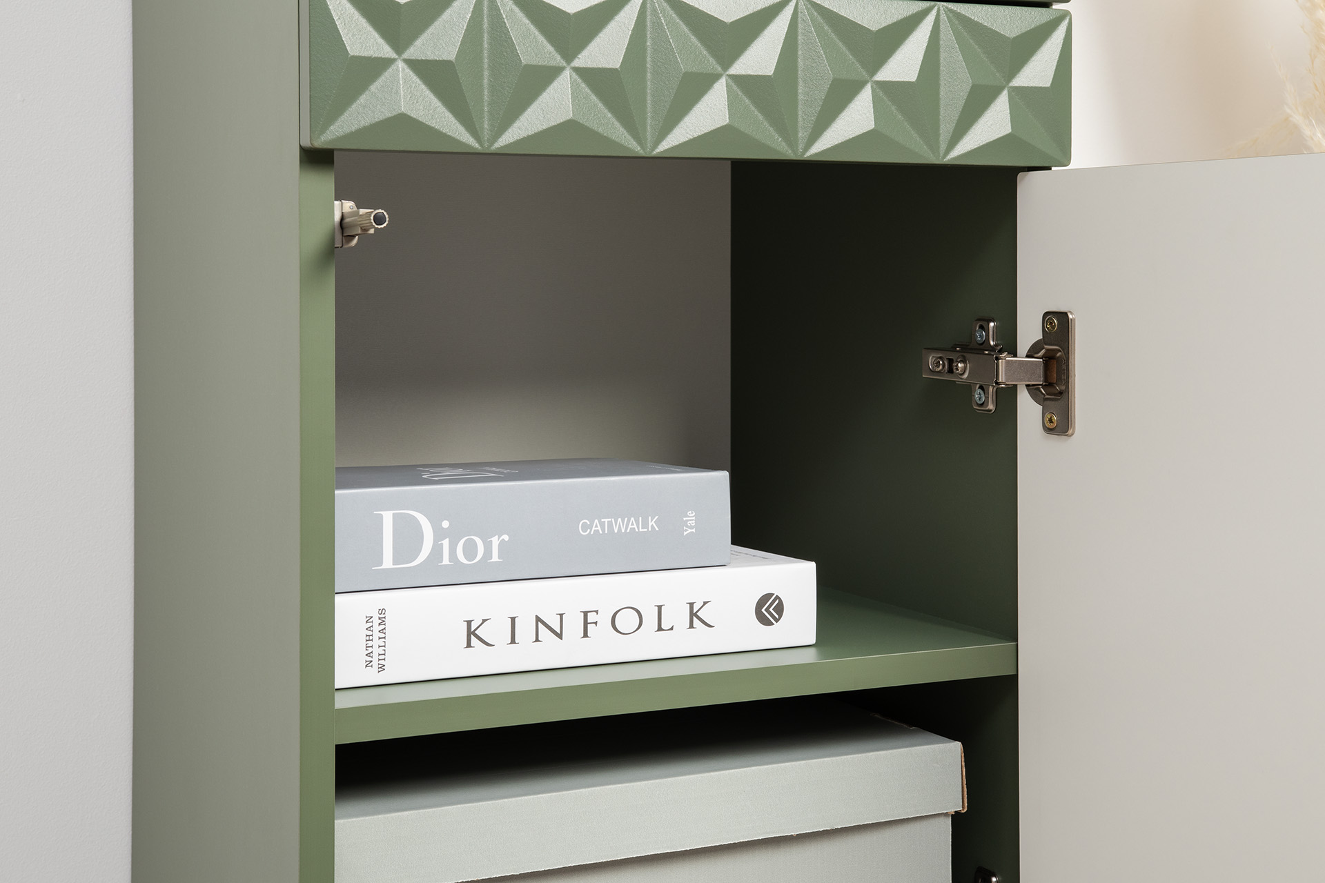 Изящные линии, глубокая фрезеровка фасадов из МДФ и благородные оттенки. Утончённая «Слоновая кость» и изысканная «Олива Шагрень» с глубоким зелёным тоном — создают атмосферу уюта, тепла и благородства. Металлические ручки и опоры золотого цвета придают мебели утончённый блеск, а петли и направляющие с доводчиками обеспечивают плавное и бесшумное закрытие фасадов.