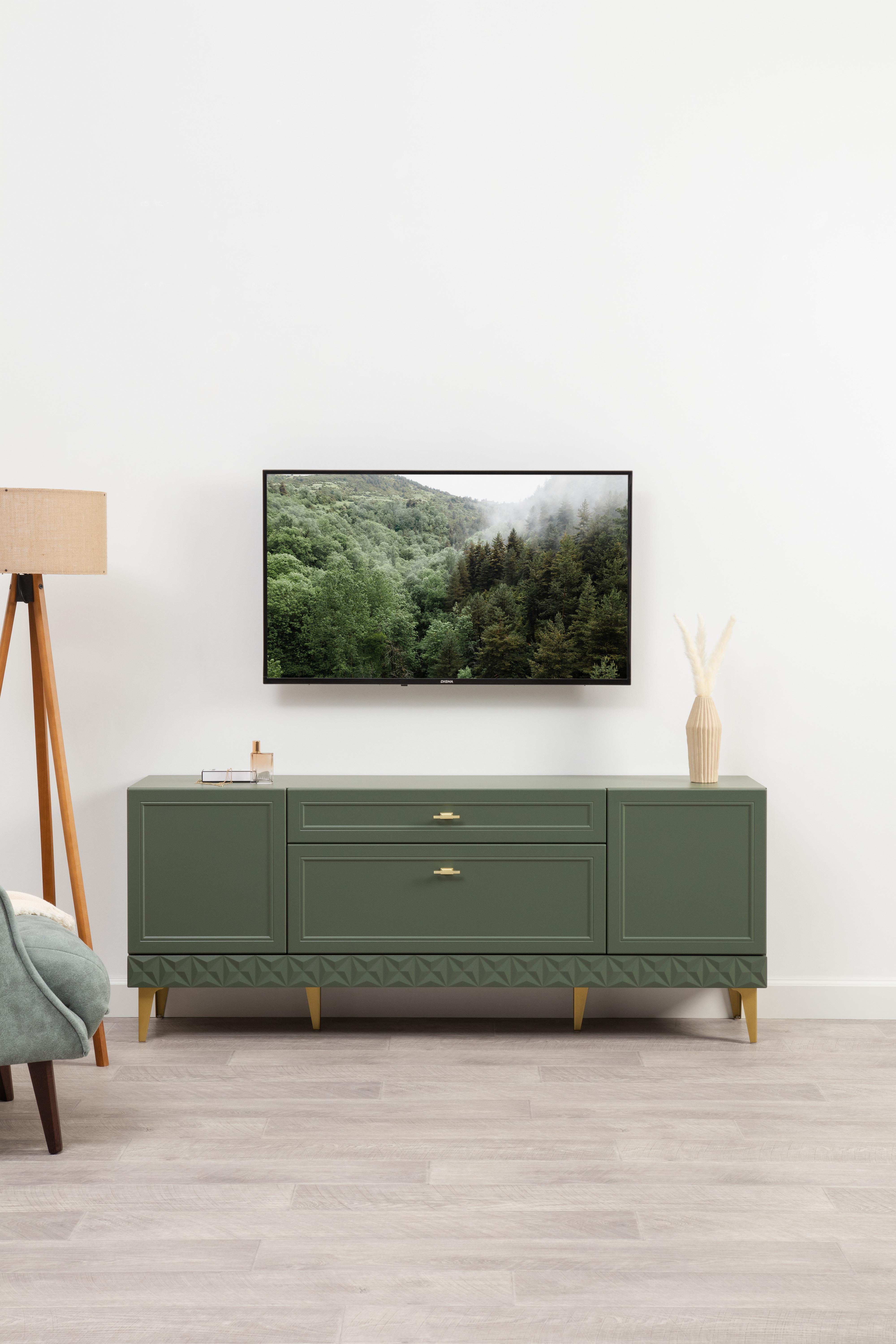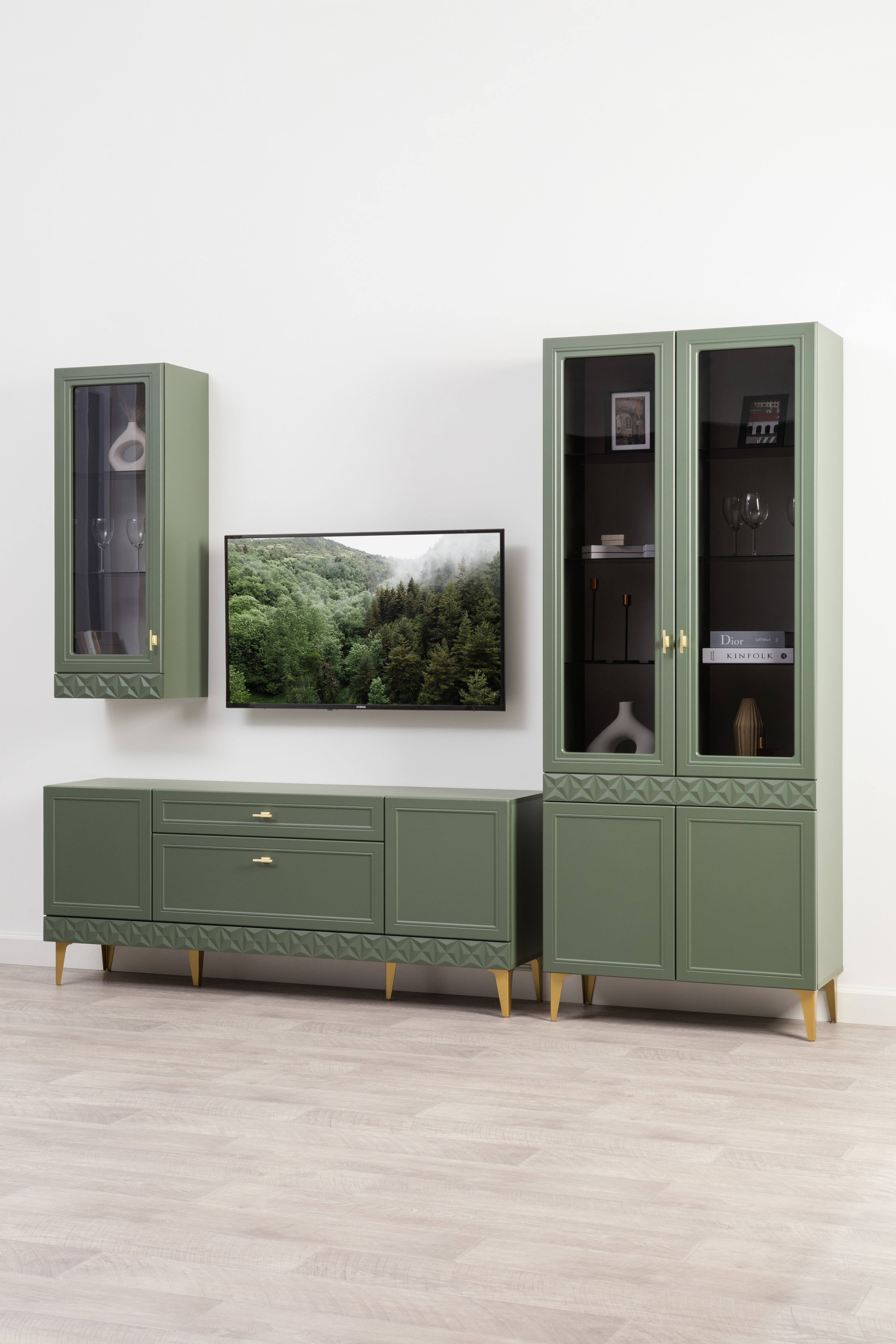 Гостиная Марион композиция 1 дымчатый зеленый K521, олива шагрень AG 1050 ПВХ, белый PE шагрень (собирается на любую сторону)