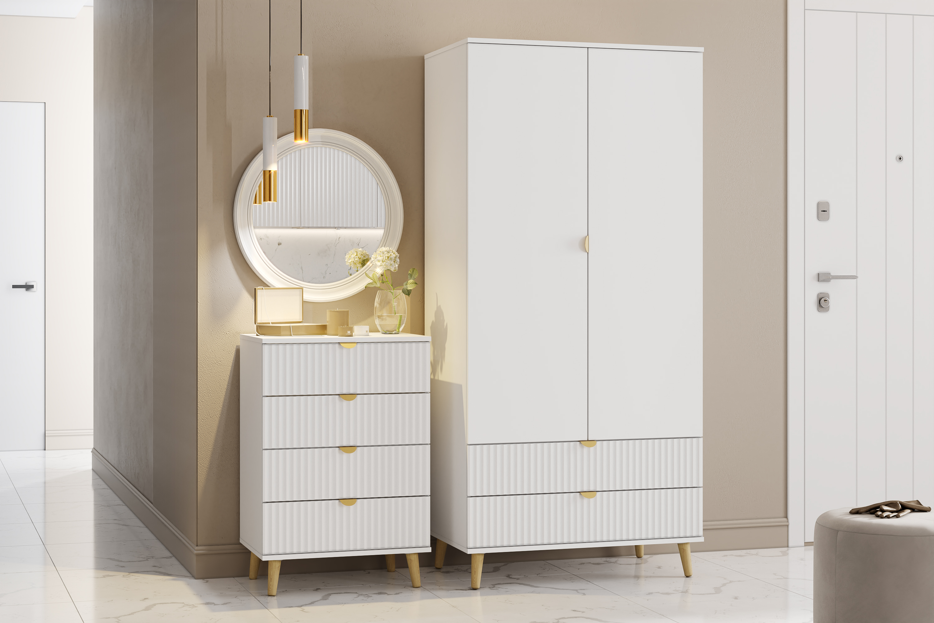 Комод оснащен четырьмя выдвижными ящиками, которые открываются плавно и бесшумно благодаря шариковым направляющим, а высокие опоры облегчают процесс уборки.
