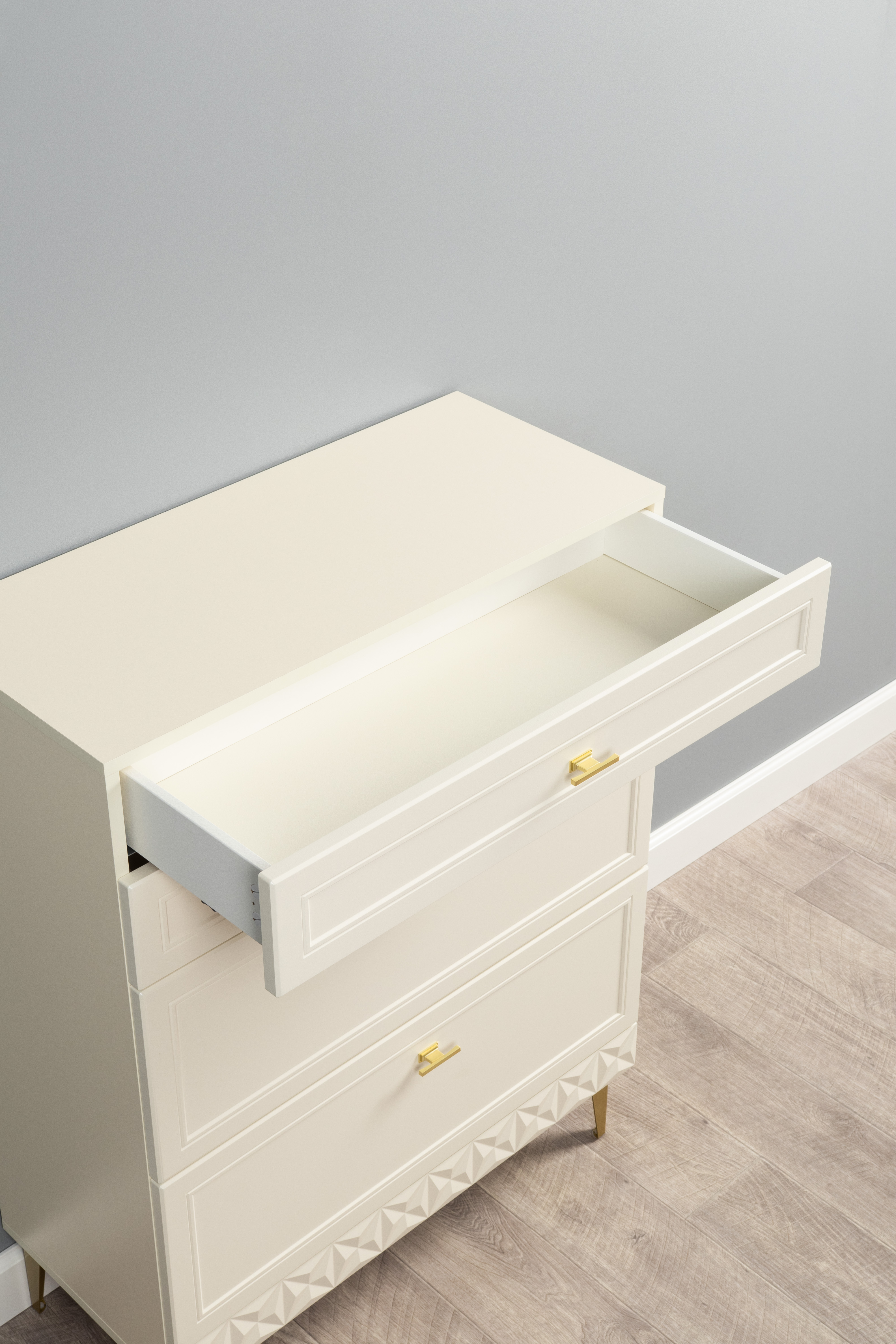 Изящные линии, глубокая фрезеровка фасадов из МДФ и благородные оттенки. Утончённая «Слоновая кость» и изысканная «Олива Шагрень» с глубоким зелёным тоном — создают атмосферу уюта, тепла и благородства. Металлические ручки и опоры золотого цвета придают мебели утончённый блеск, а петли и направляющие с доводчиками обеспечивают плавное и бесшумное закрытие фасадов.
