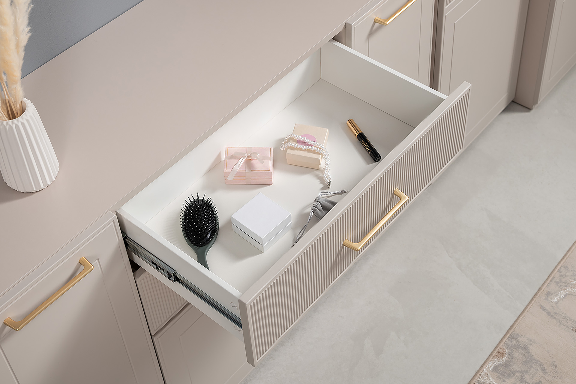 Петли с доводчиками, полное выдвижение ящиков, выдвижная штанга в шкафу для одежды и съемные полки делают использование максимально комфортным.