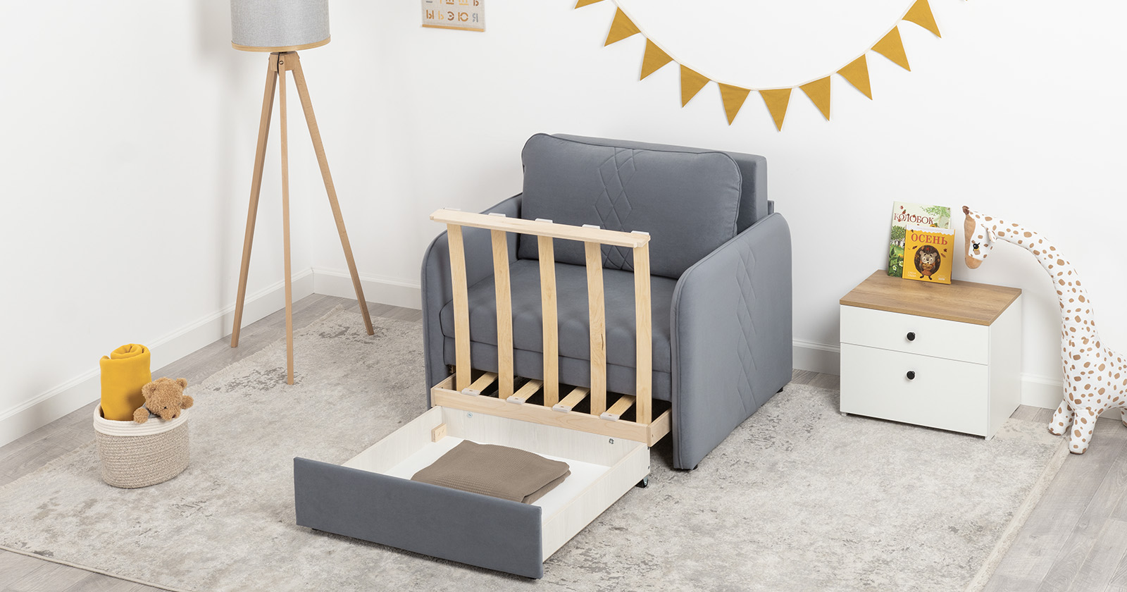 Стильный компактный диван для детской и гостиной. При своих скромных размерах он трансформируется в полноценное спальное место для детей и подростков. Лаконичный дизайн в виде декоративной стежки подчеркивает фактуру велюра, а небольшие размеры позволят разместить его в любом пространстве.