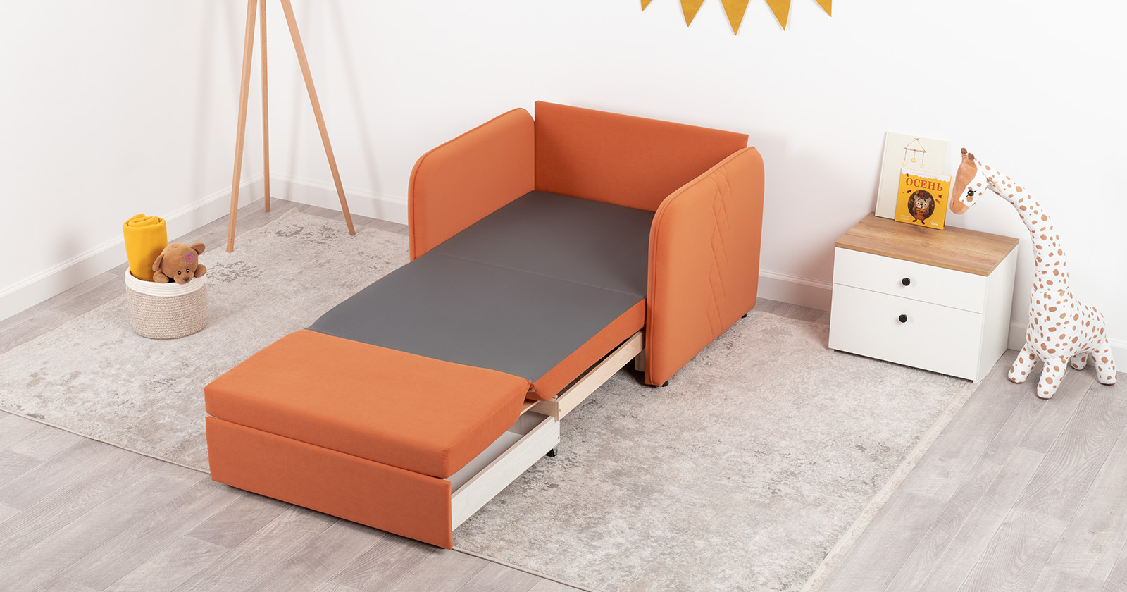 Стильный компактный диван для детской и гостиной. При своих скромных размерах он трансформируется в полноценное спальное место для детей и подростков. Лаконичный дизайн в виде декоративной стежки подчеркивает фактуру велюра, а небольшие размеры позволят разместить его в любом пространстве.