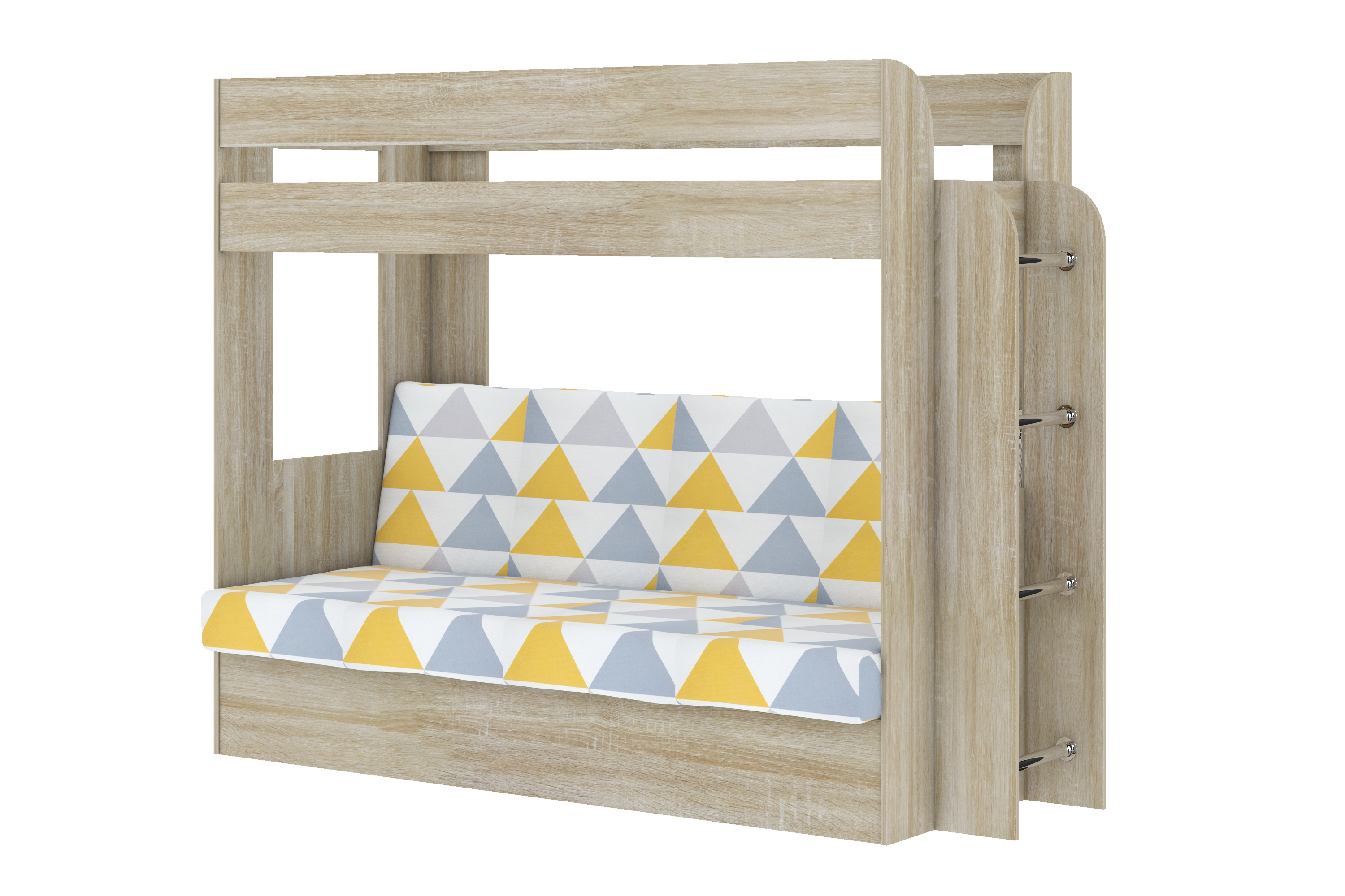 Кровать детская двухъярусная Карамель 75 Дуб Сонома, диван - велюр OTTO YELLOW желтые треугольники (сборка на любую сторону) спальное место верх 80х190, низ 120х185