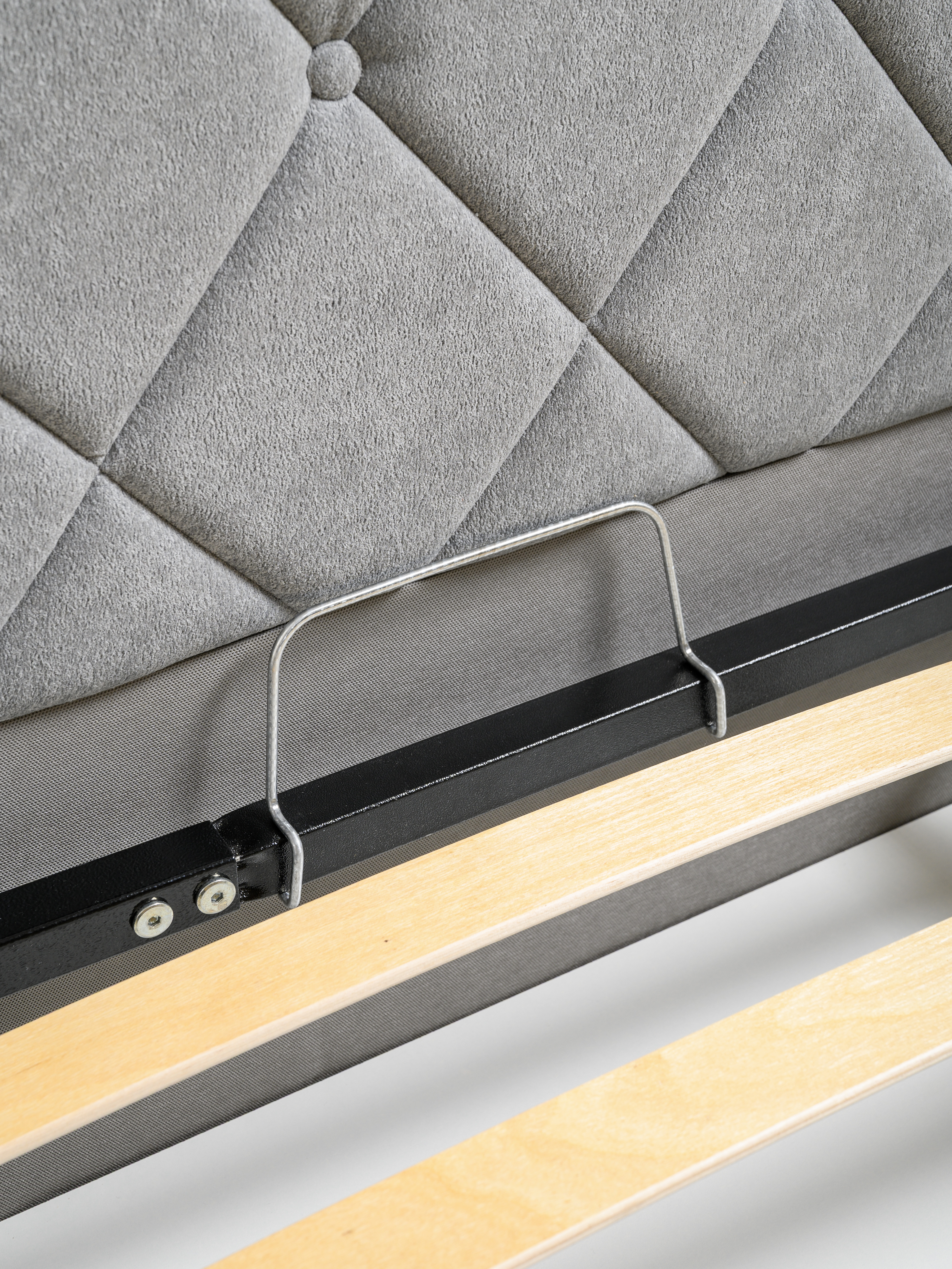 Основание кровати укомплектовано матрасодержателями. Жесткое кроватное дно из ЛДСП 16 мм на опорах 25 мм.