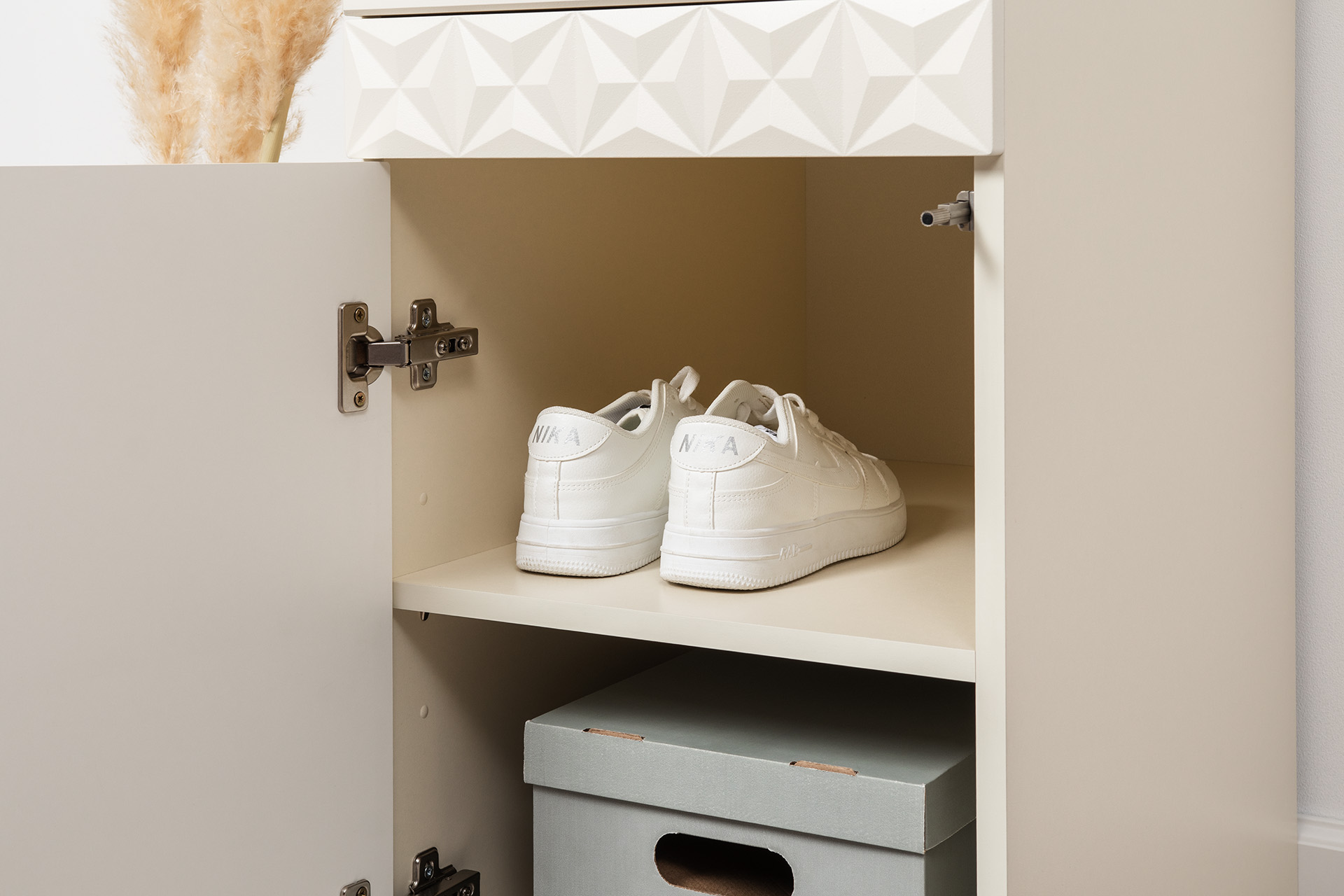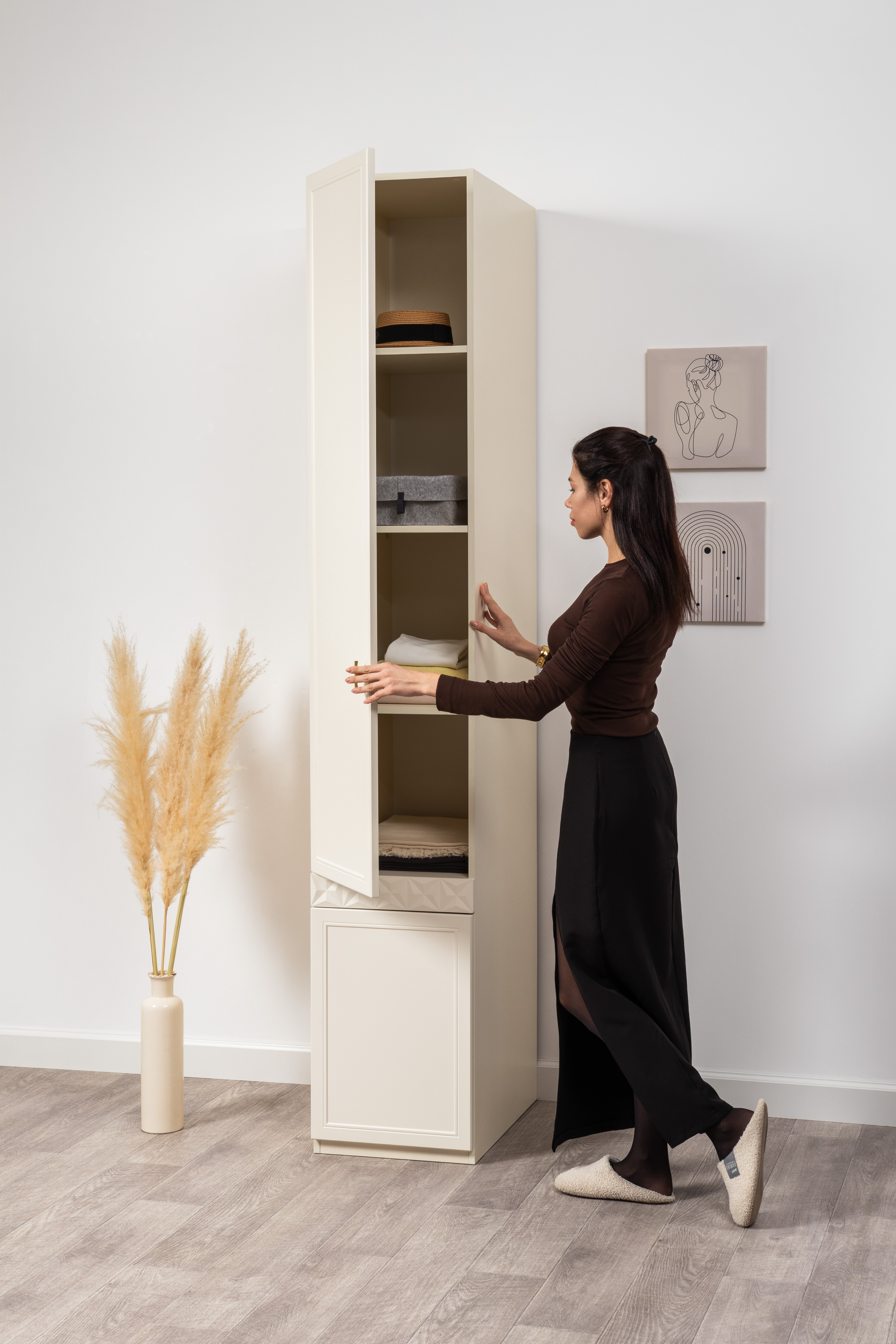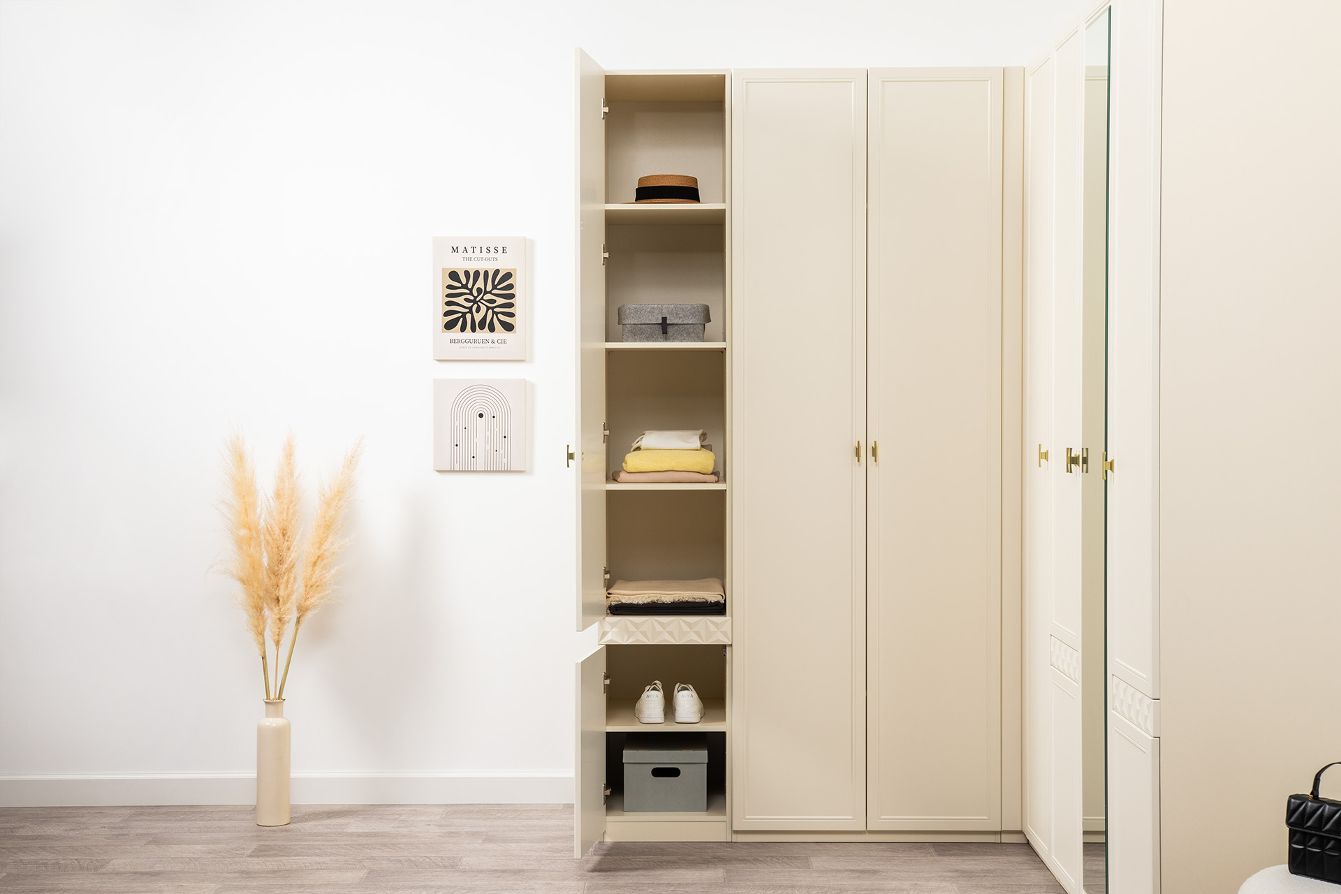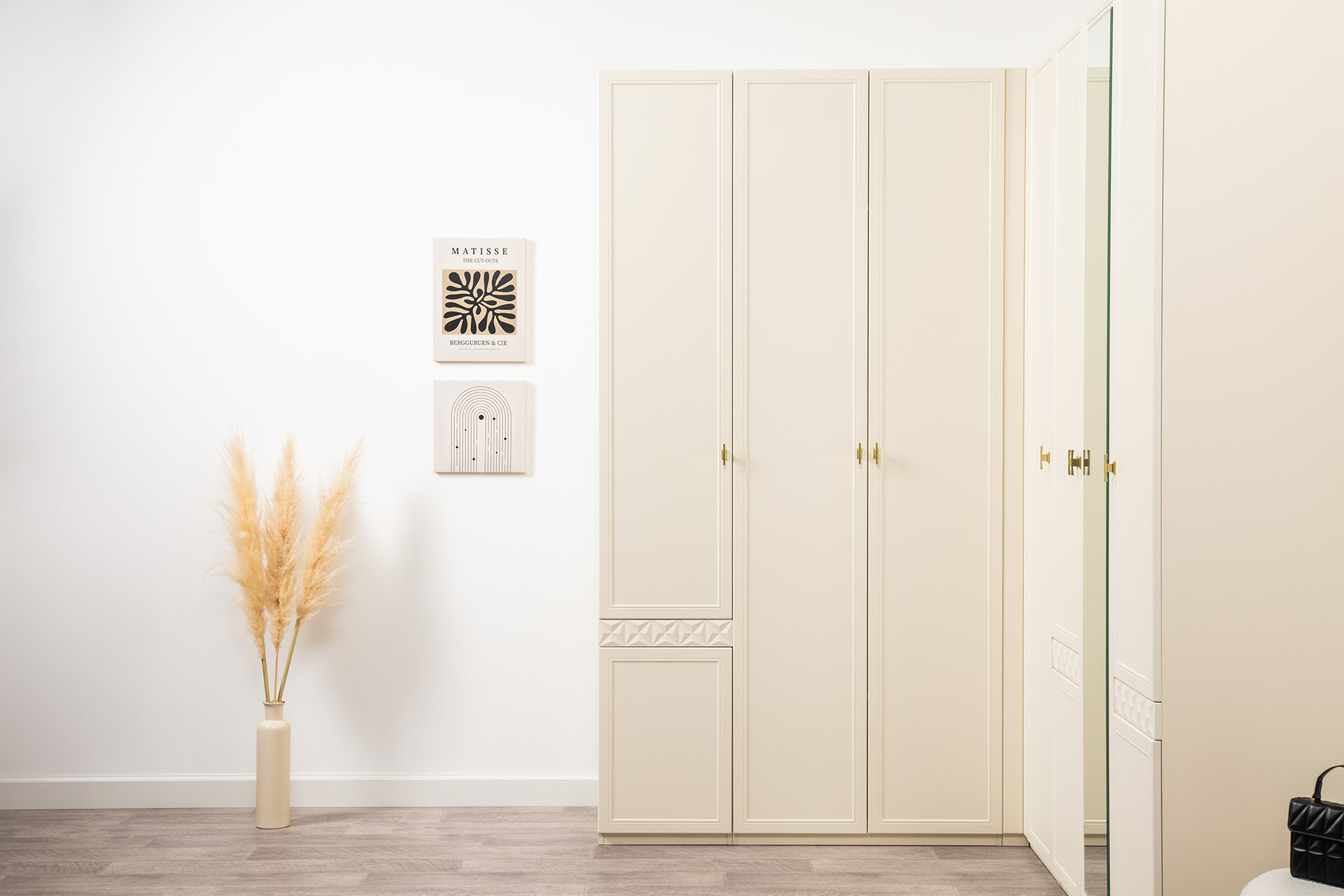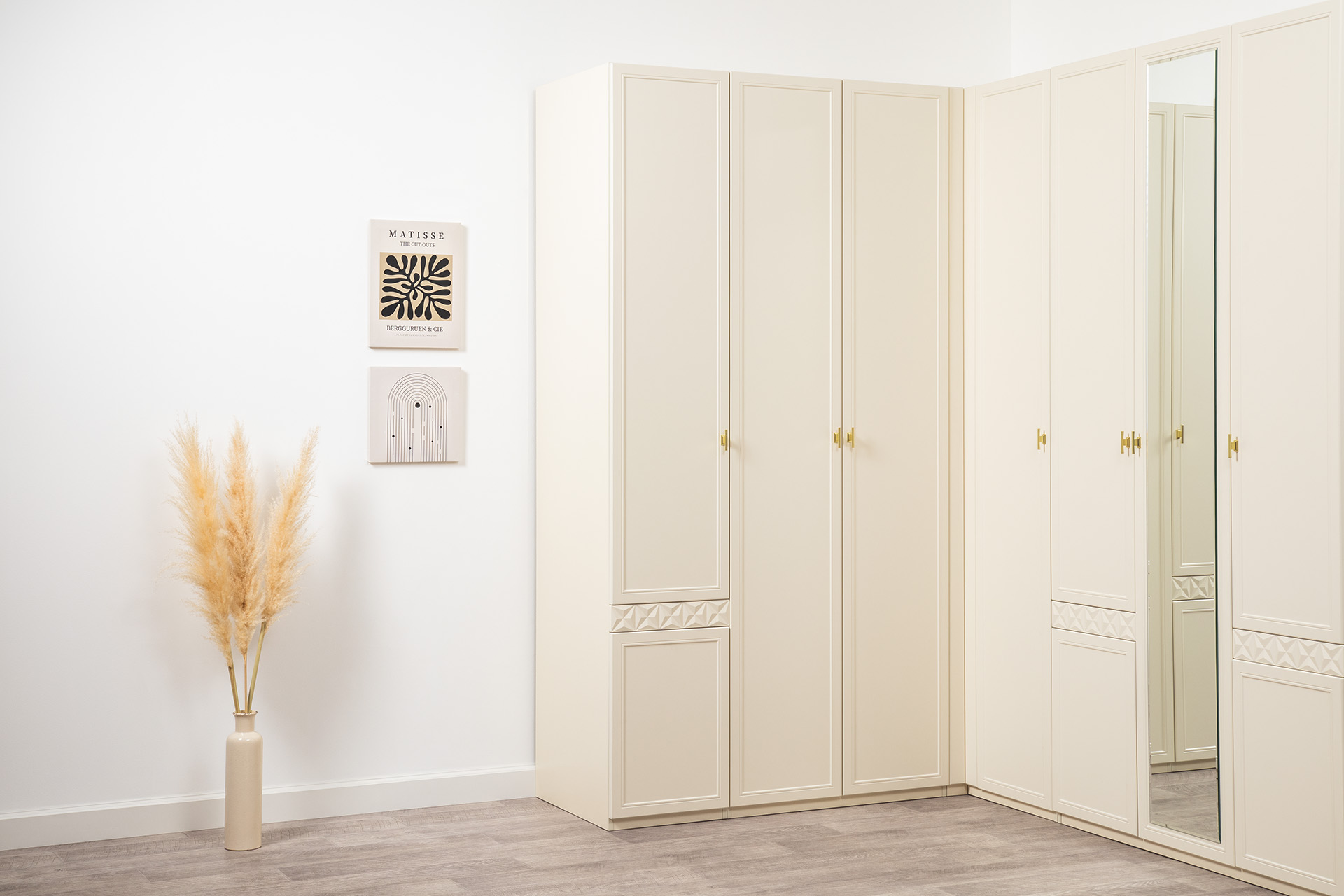 Изящные линии, глубокая фрезеровка фасадов из МДФ и благородные оттенки. Утончённая «Слоновая кость» и изысканная «Олива Шагрень» с глубоким зелёным тоном — создают атмосферу уюта, тепла и благородства. Металлические ручки и опоры золотого цвета придают мебели утончённый блеск, а петли и направляющие с доводчиками обеспечивают плавное и бесшумное закрытие фасадов.