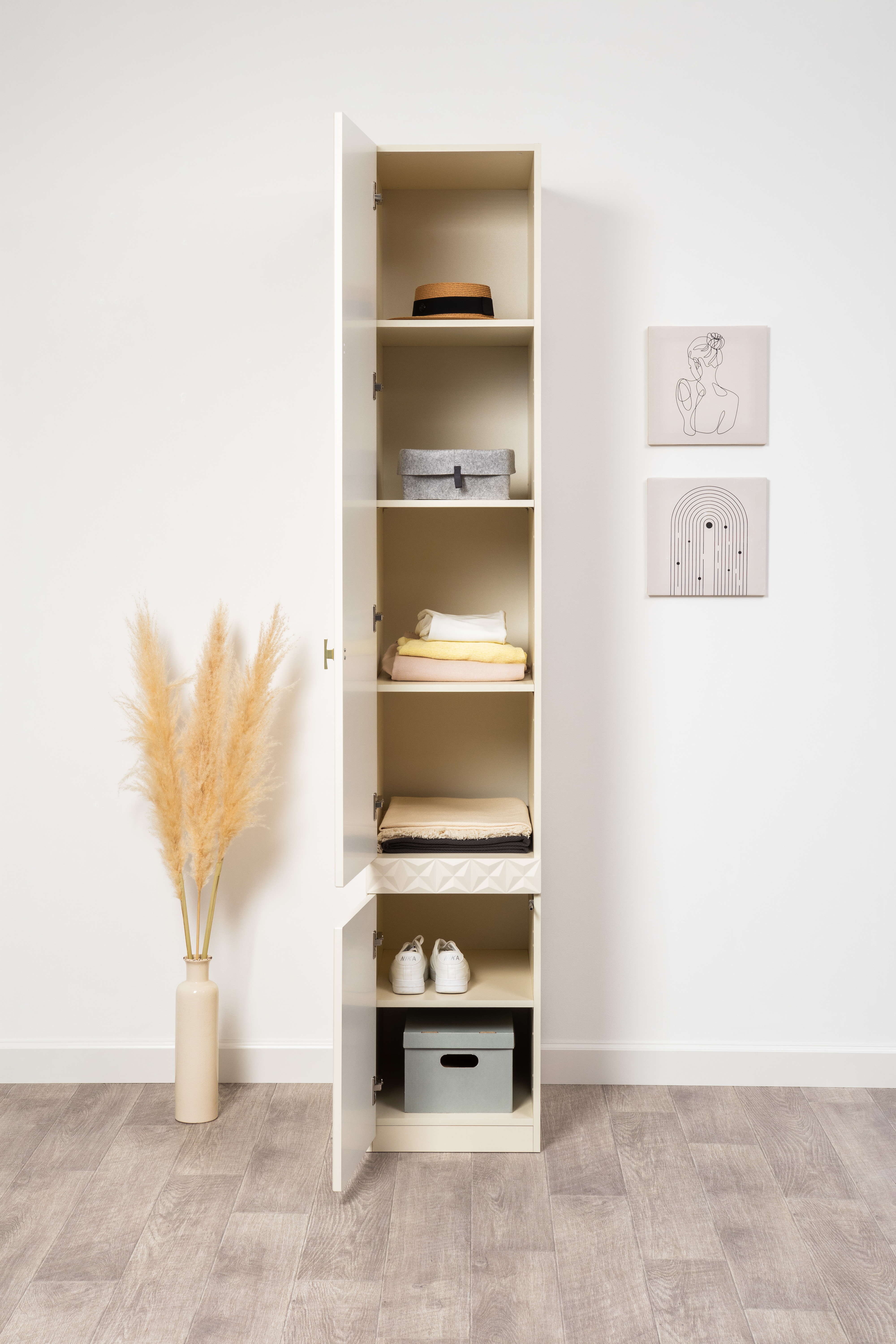 Шкаф-пенал в гостиную Ливерпуль белый, ясень ваниль ПВХ