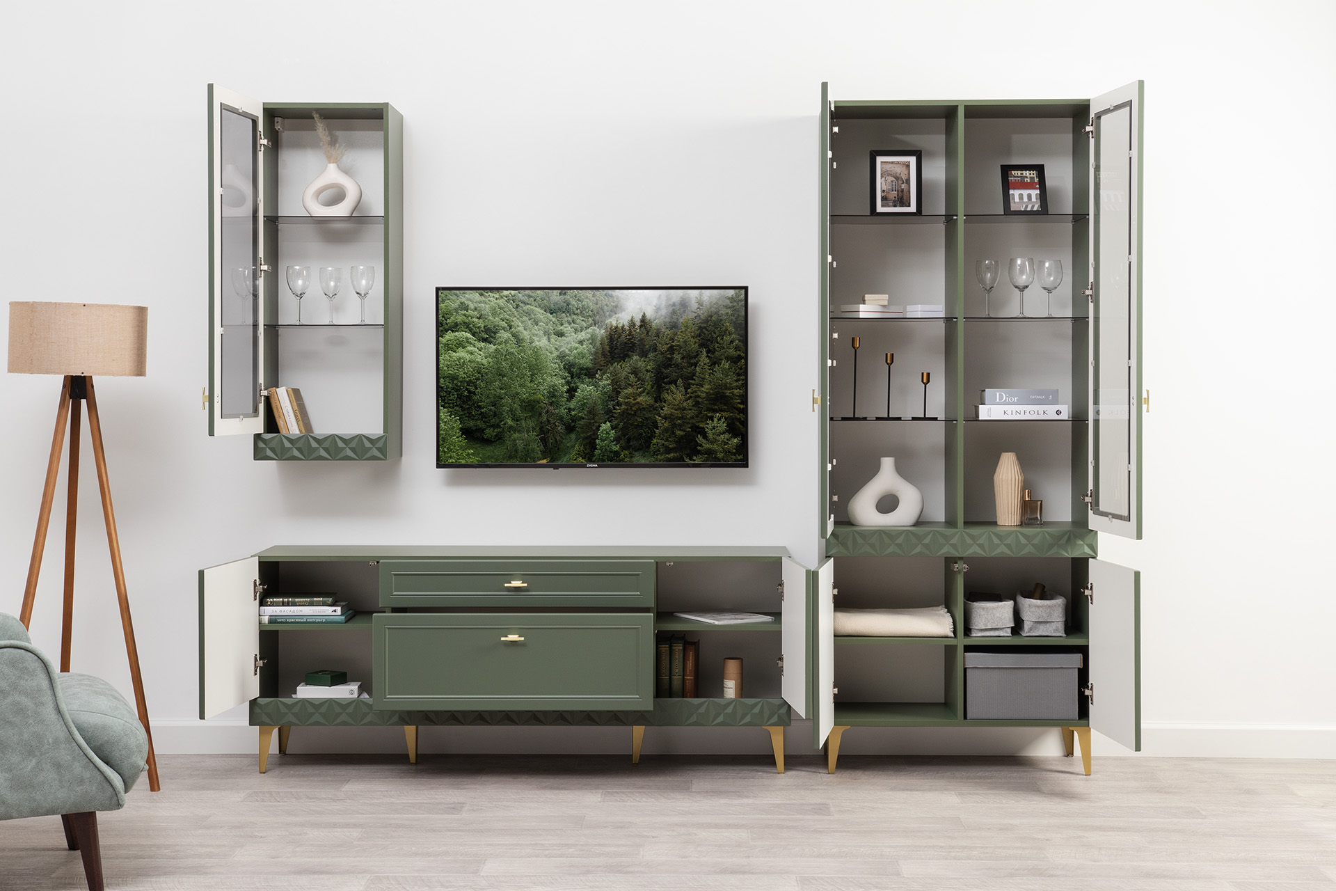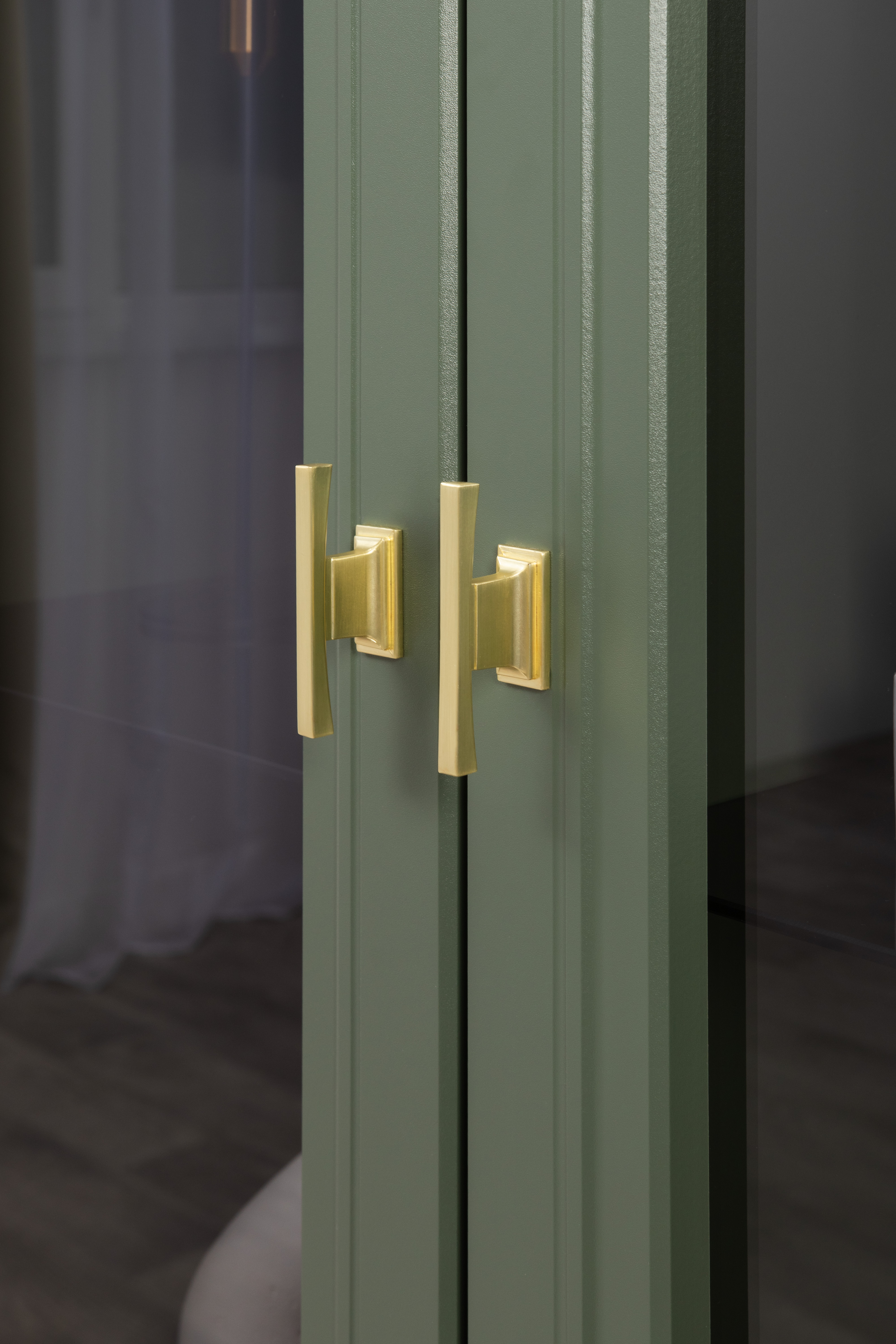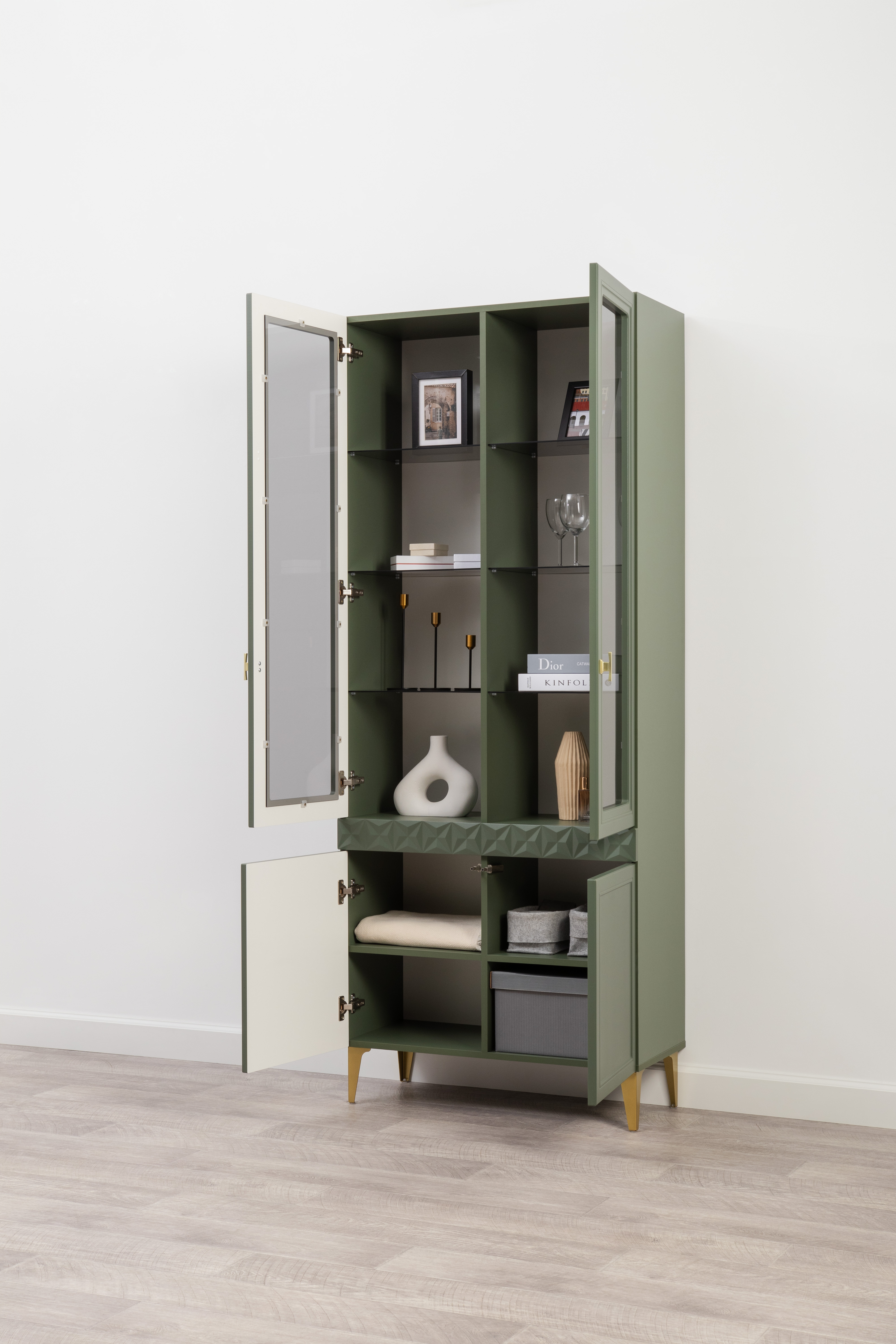 Шкаф-витрина Марион 16.397.02 дымчатый зеленый K521, олива шагрень AG 1050 ПВХ (собирается на любую сторону)
