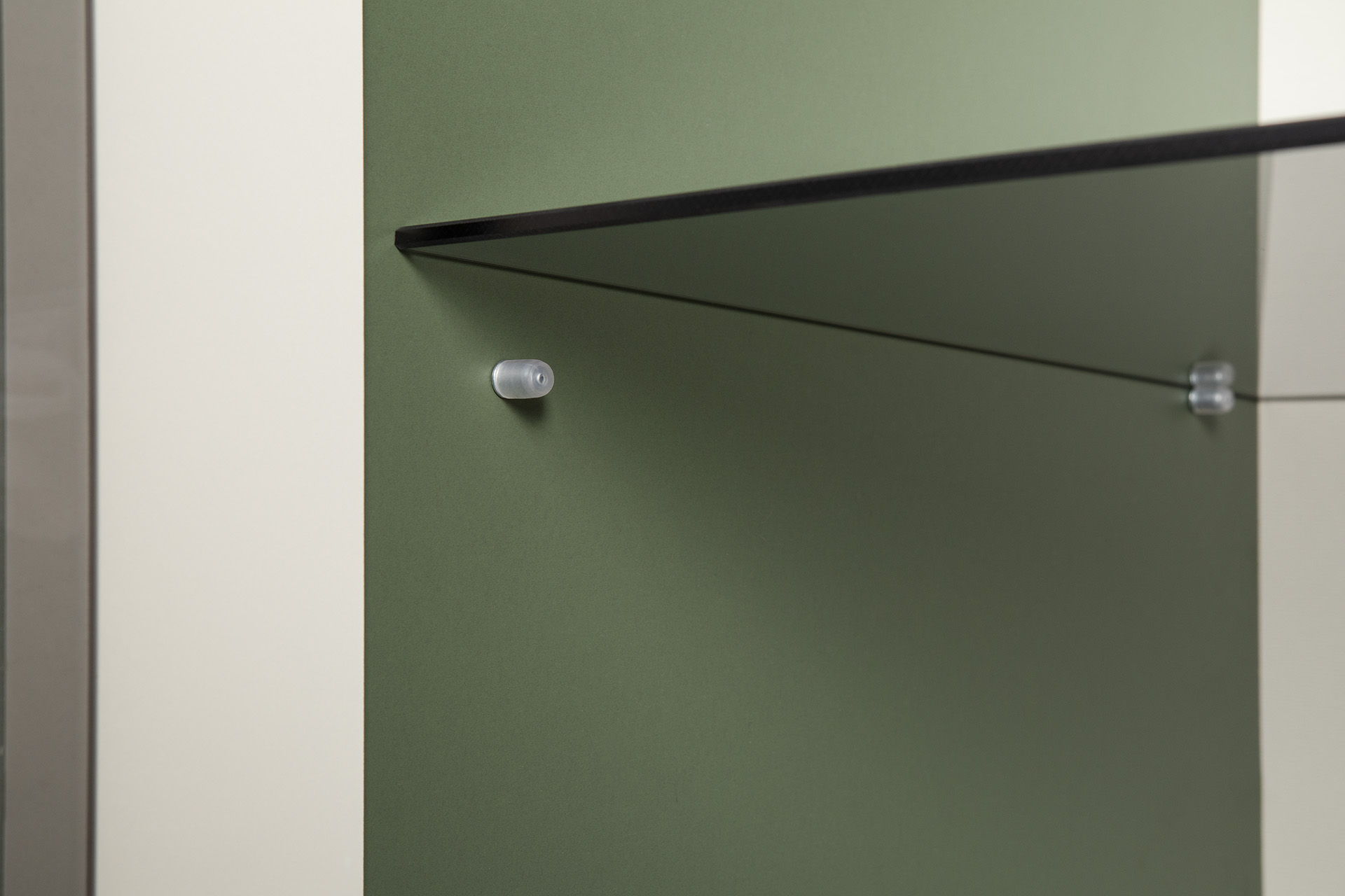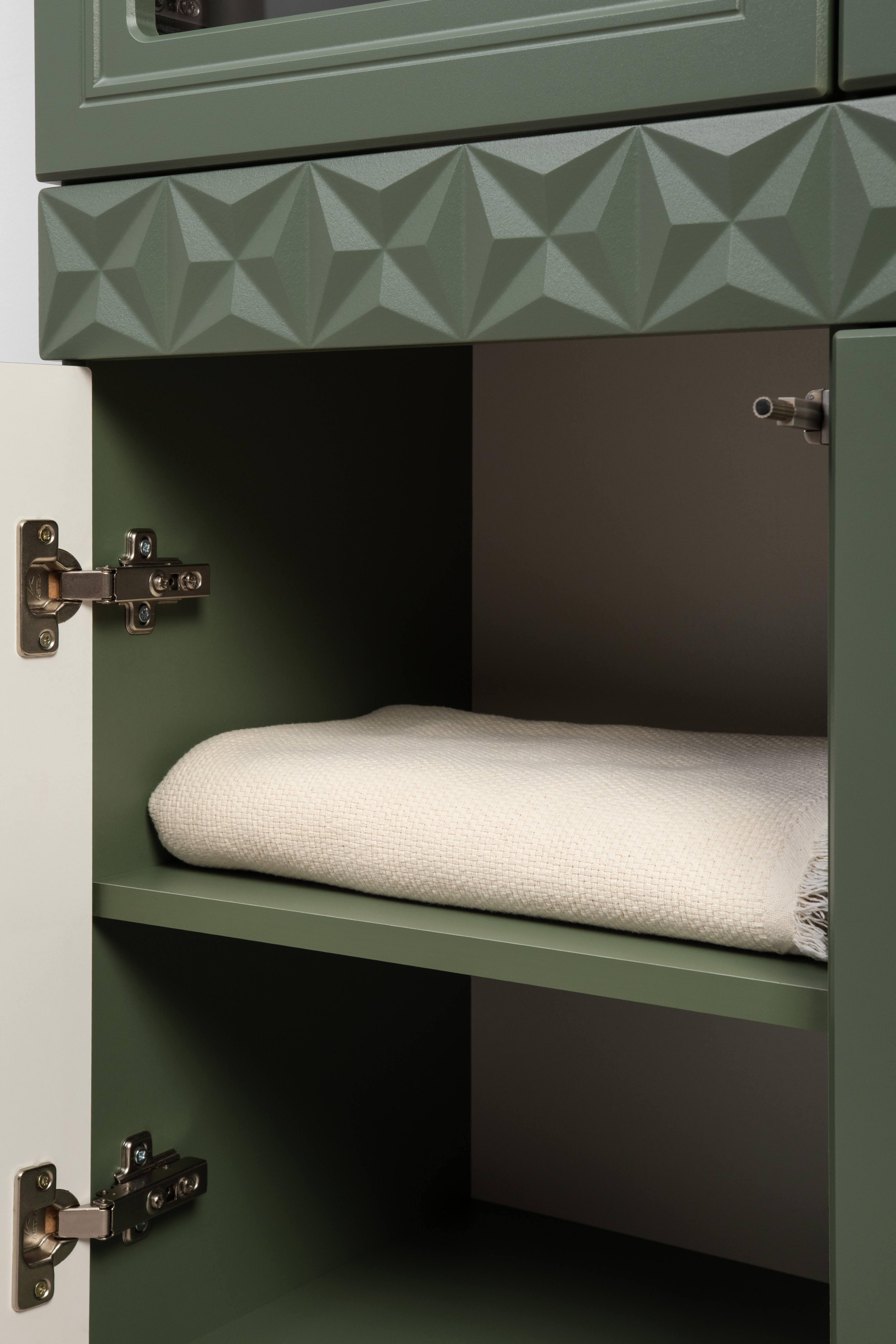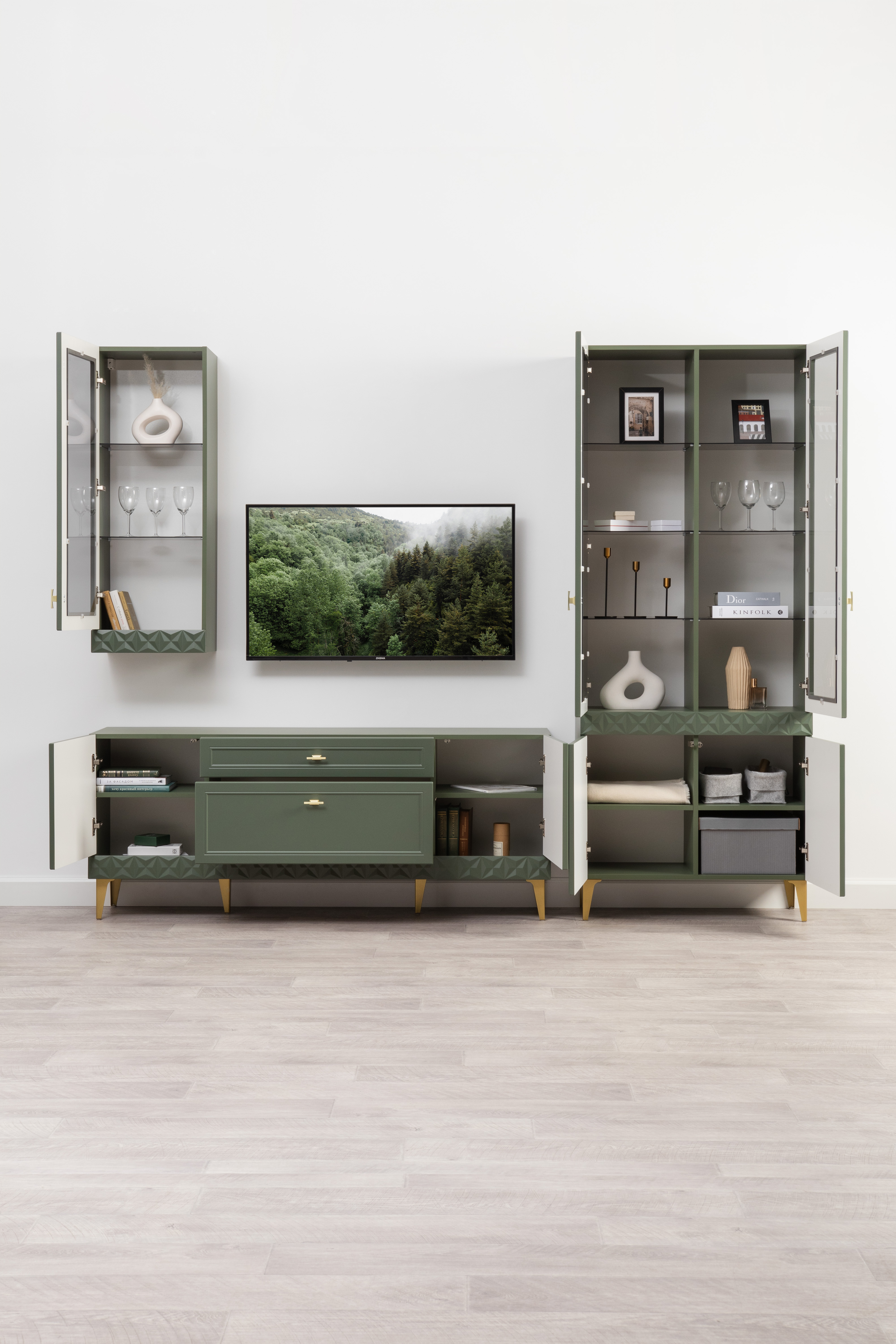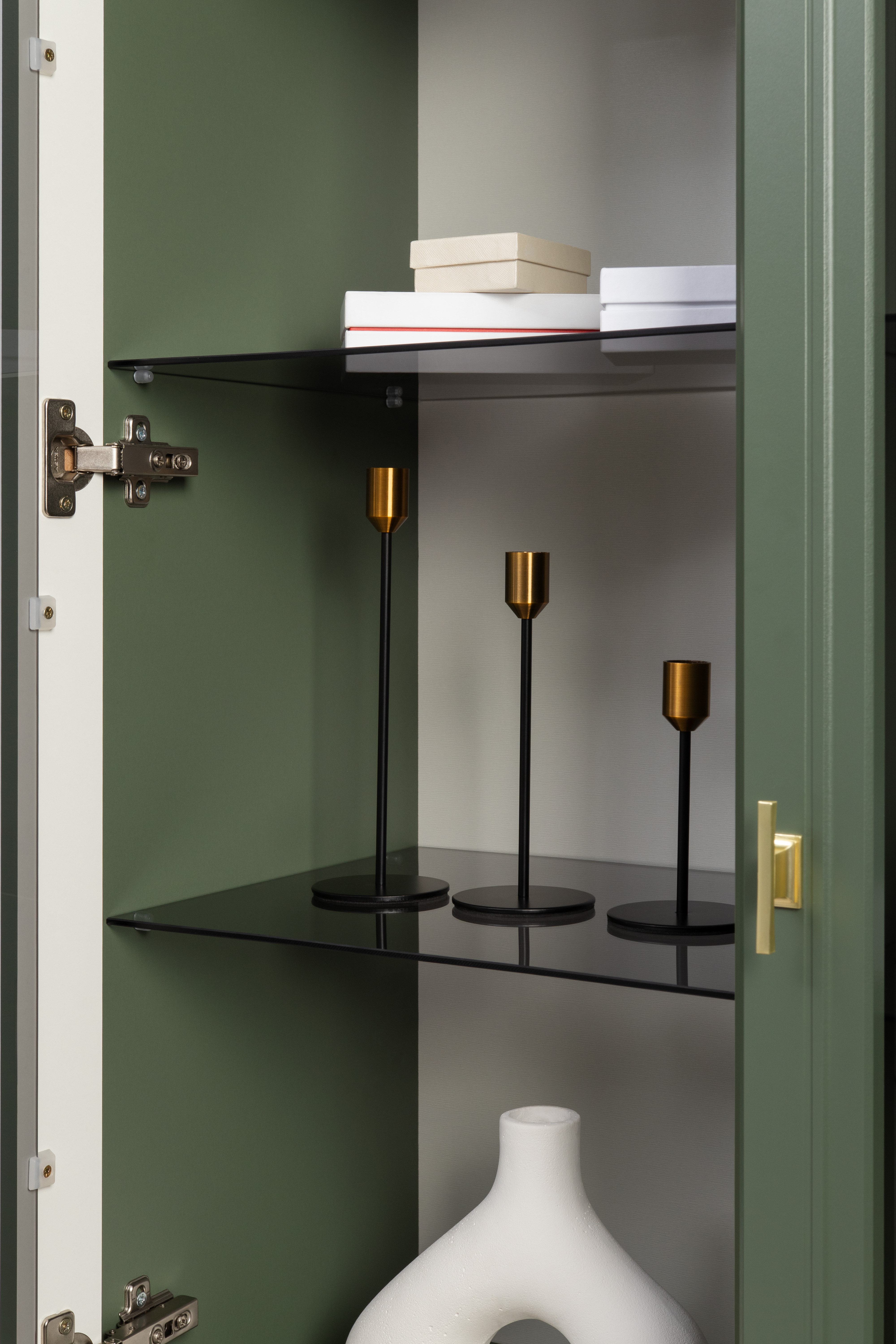Шкаф-витрина Марион 16.397.02 дымчатый зеленый K521, олива шагрень AG 1050 ПВХ (собирается на любую сторону)