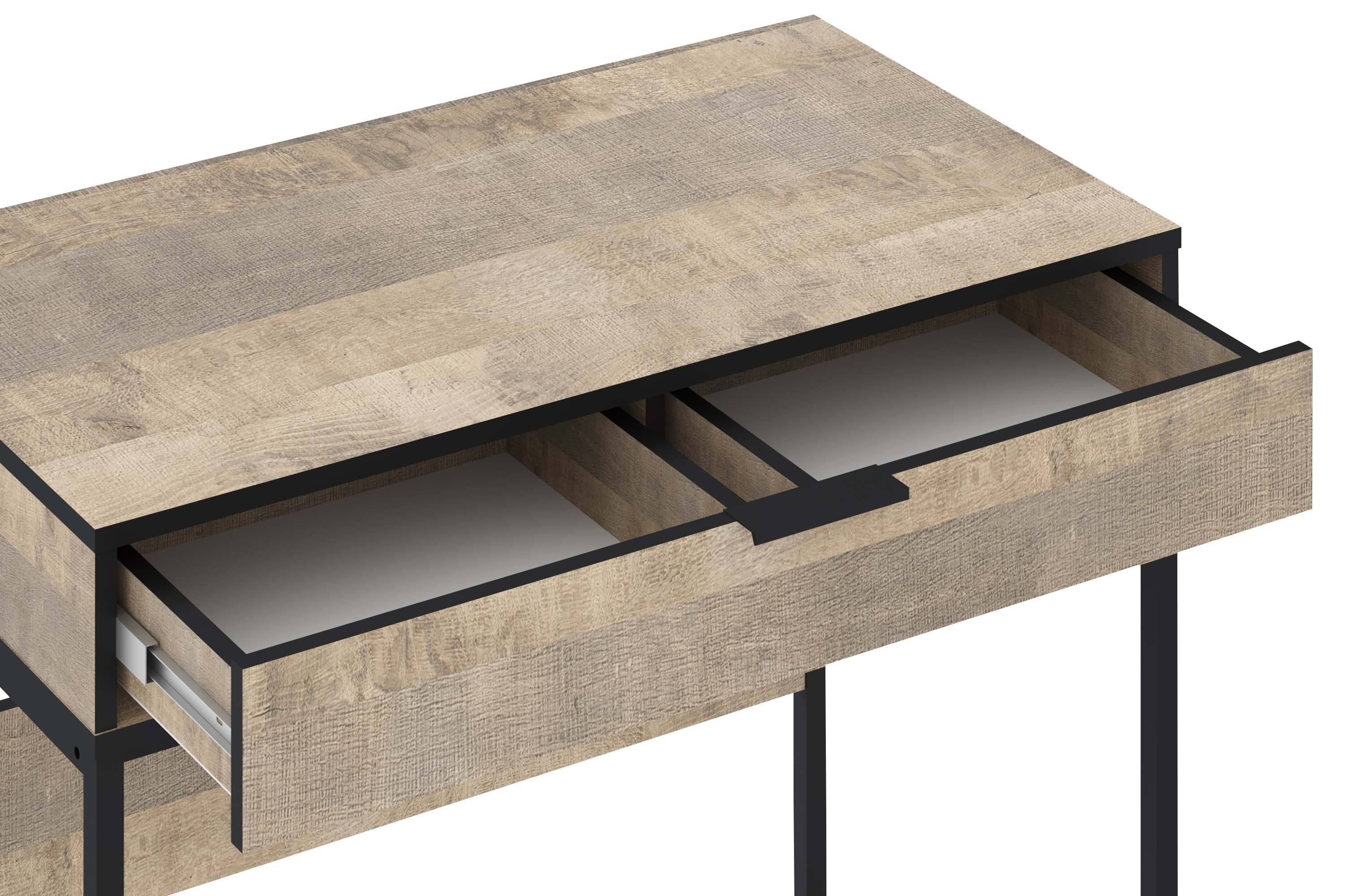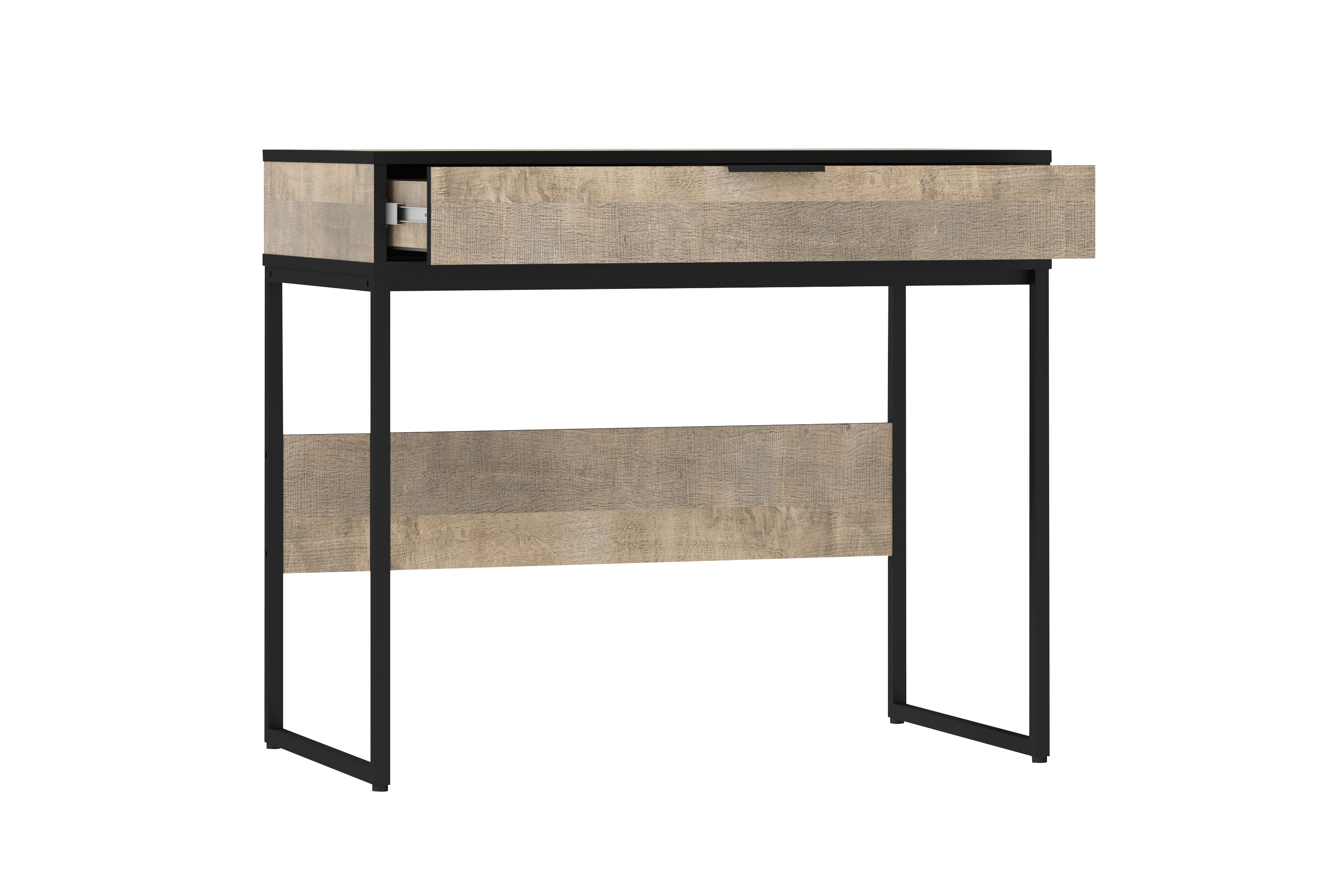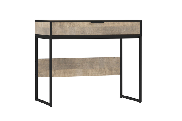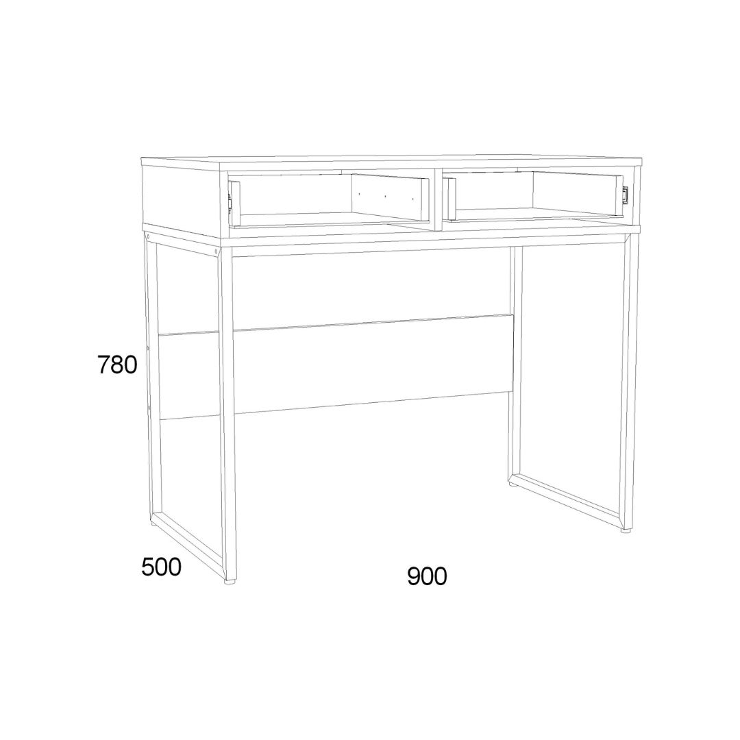 НМ 011.96 Стол. Габаритные размеры (ШхГхВ): 90 х 50 х 78. Предназначен для выполнения письменных работ и аналогичных занятий сидя. Представляет собой каркас из панелей ЛДСП с выдвижным ящиком, установленный на металлическое основание. Изделие стандартной сборки. Фурнитура: - Направляющие h-35 шариковые полного выдвижения 350 Gelony (35.350), - Опора для стола TBL 030.896.496.628 чёрный, - Ручка СА-1 96 Алди черный. В качестве крепежа используются шканты и эксцентриковые стяжки. Все видимые отверстия закрываются заглушками в цвет корпуса.