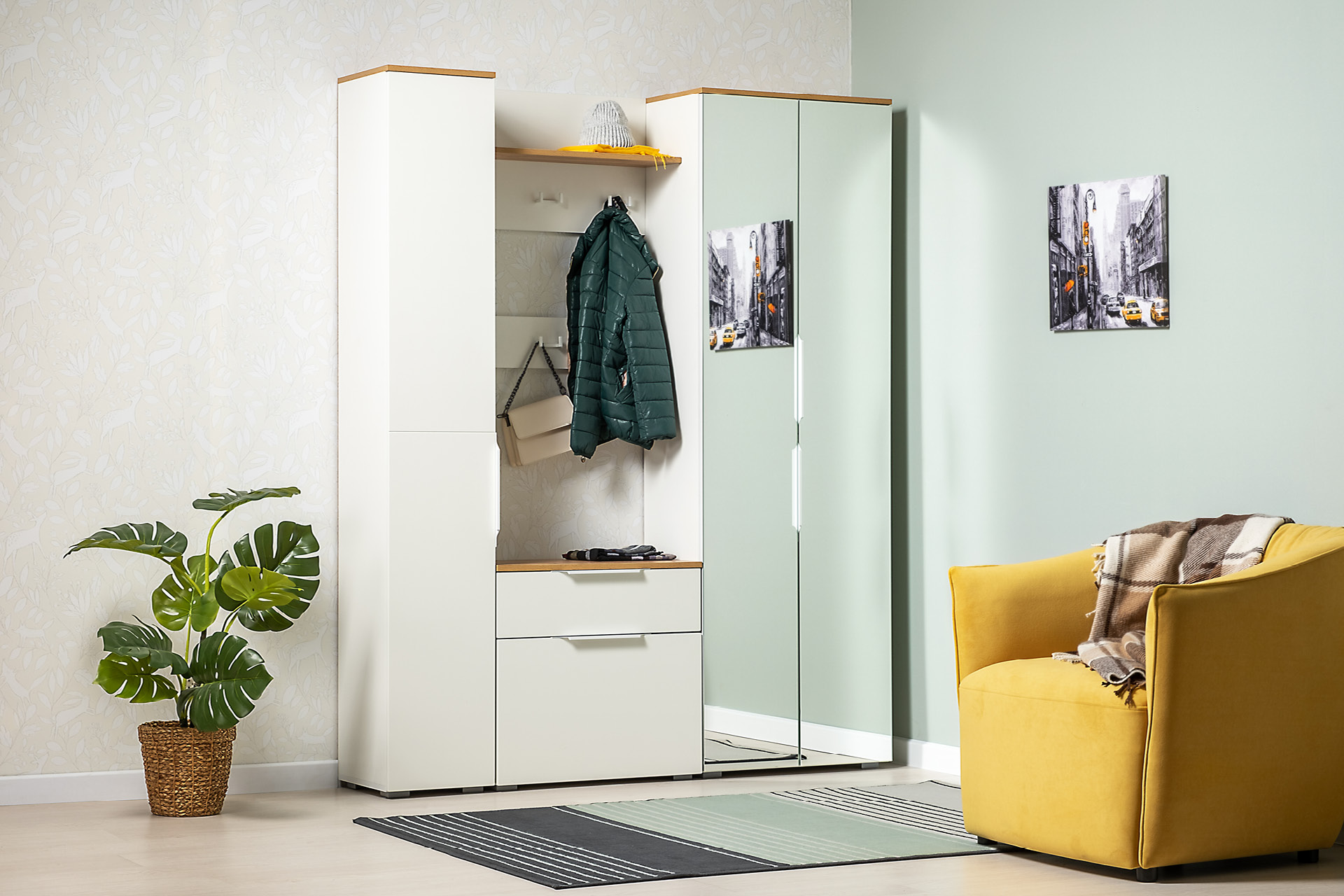Зеркальные створки шкафа визуально расширяют пространство, а минималистичные алюминиевые ручки подчеркивают легкость и простоту линий.