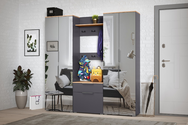 Зеркальные створки шкафа визуально расширяют пространство, а минималистичные алюминиевые ручки подчеркивают легкость и простоту линий.